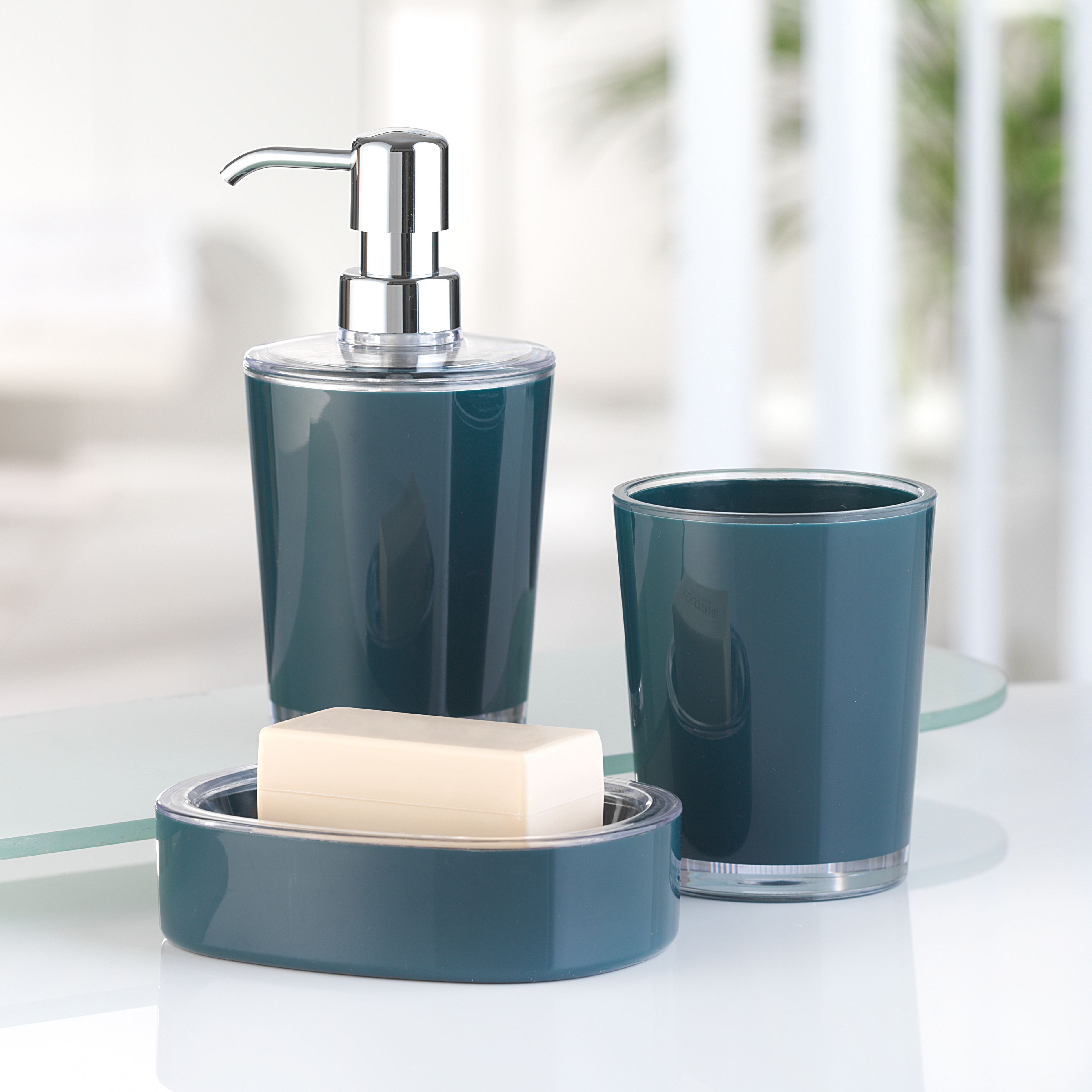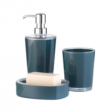 Набор аксессуаров для ванной комнаты: стакан косметический, мыльница, дозатор для жидкого мыла (объем 400мл). Произведено из пластика. Цвет петроль. Глянцевая поверхность. Упаковано в картонную коробку.