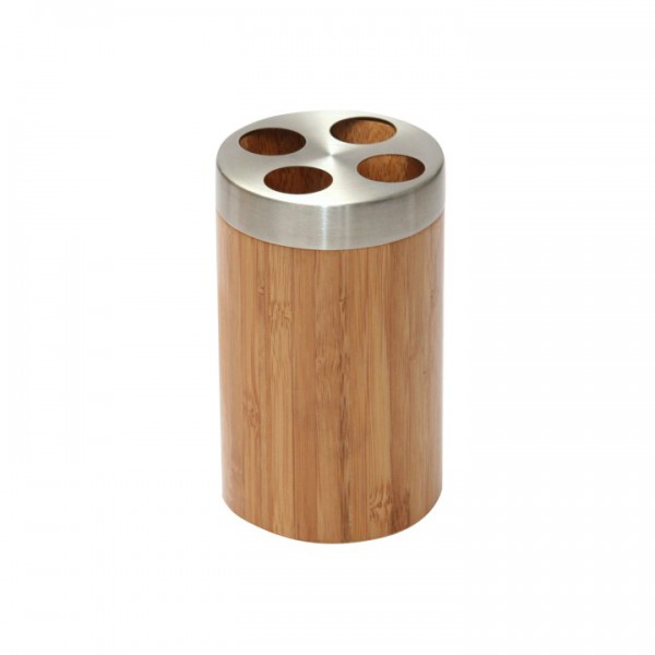 Стакан для зубных щеток. Произведено из хромированной стали и бамбукового дерева.