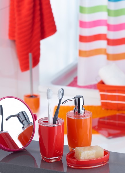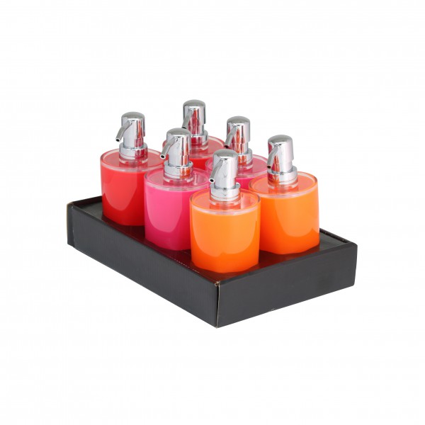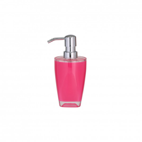Дозатор для жидкого мыла. Объем 250мл. Произведено из пластика. Цвета на выбор - розовый, оранжевый, красный. Поверхность глянцевая.