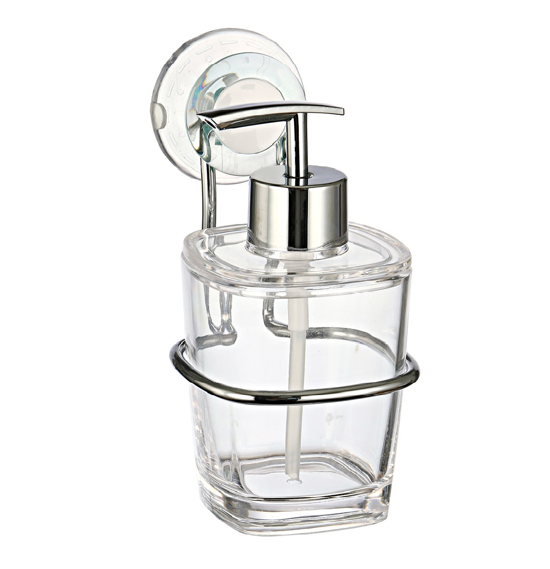 Дозатор для жидкого мыла. Прозрачный, с элементами белого и светло-зеленого цветов. Крепится на гладкую поверхность при помощи присоски. Произведено из пластика и хромированной стали.