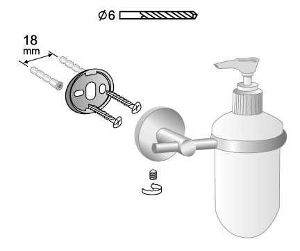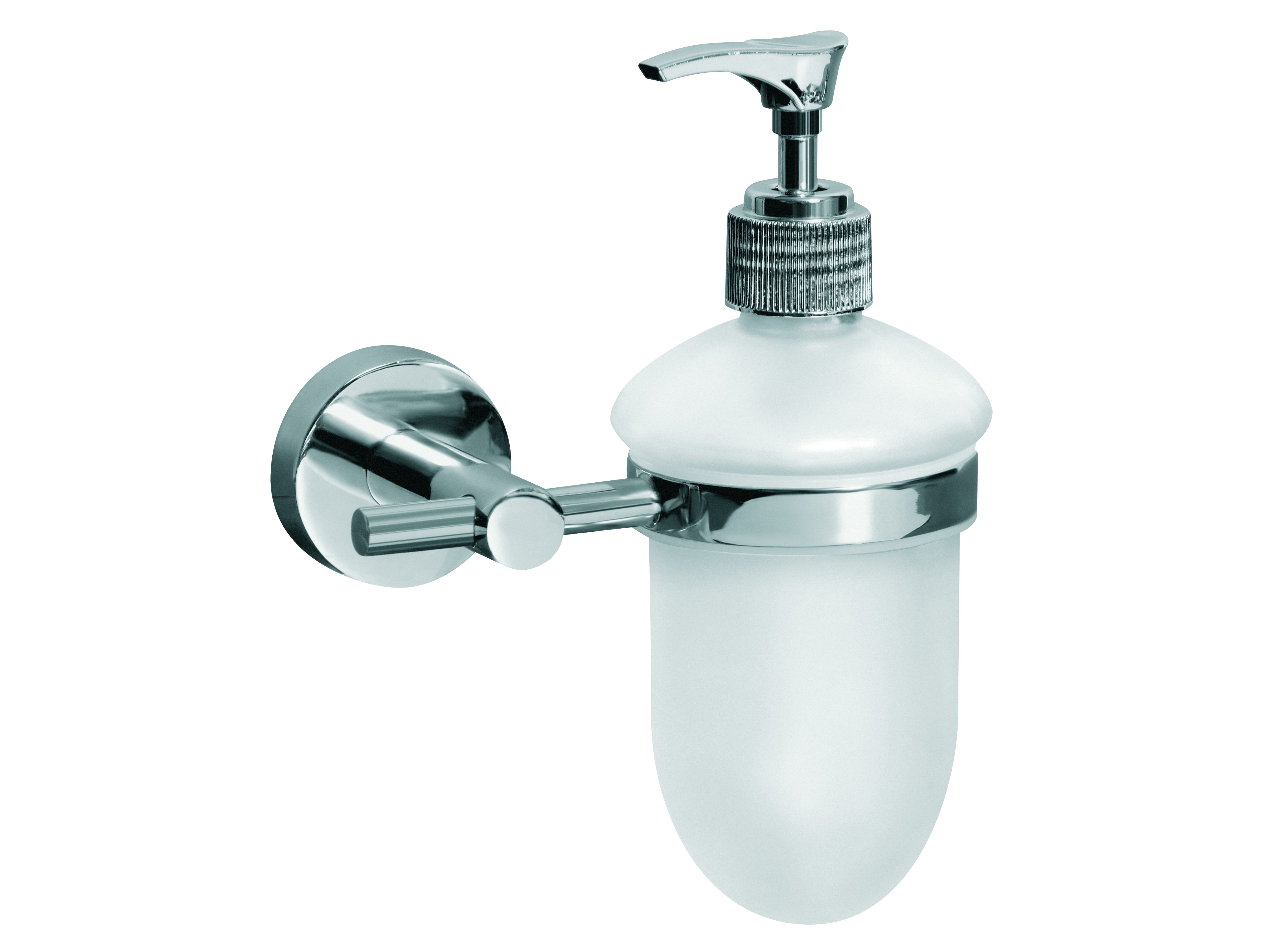 Дозатор для жидкого мыла с захватом. Объем 150мл. Крепится к стене шурупами или специальным двухкомпонентным клеем для металла и керамики. Произведено из цинкоалюминиевого сплава, покрытого хромом, и матового стекла.