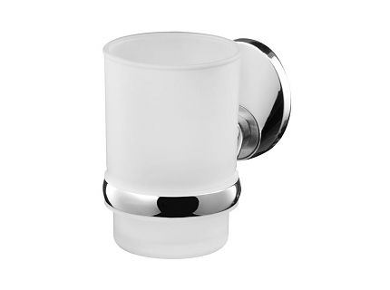 Стакан одинарный с держателем. Крепится к стене шурупами или специальным двухкомпонентным клеем для металла и керамики. Произведено из цинкоалюминиевого сплава, покрытого хромом, и матового стекла.