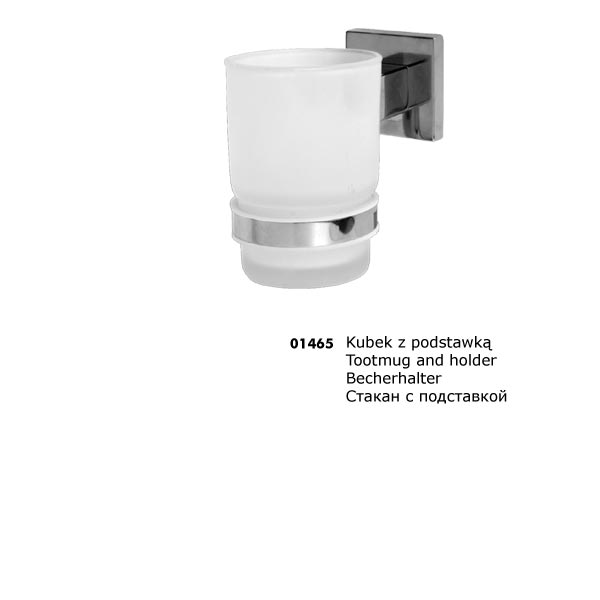Стакан одинарный с держателем. Крепится к стене шурупами или специальным двухкомпонентным клеем для металла и керамики. Произведено из цинкоалюминиевого сплава, покрытого хромом, и матового стекла.