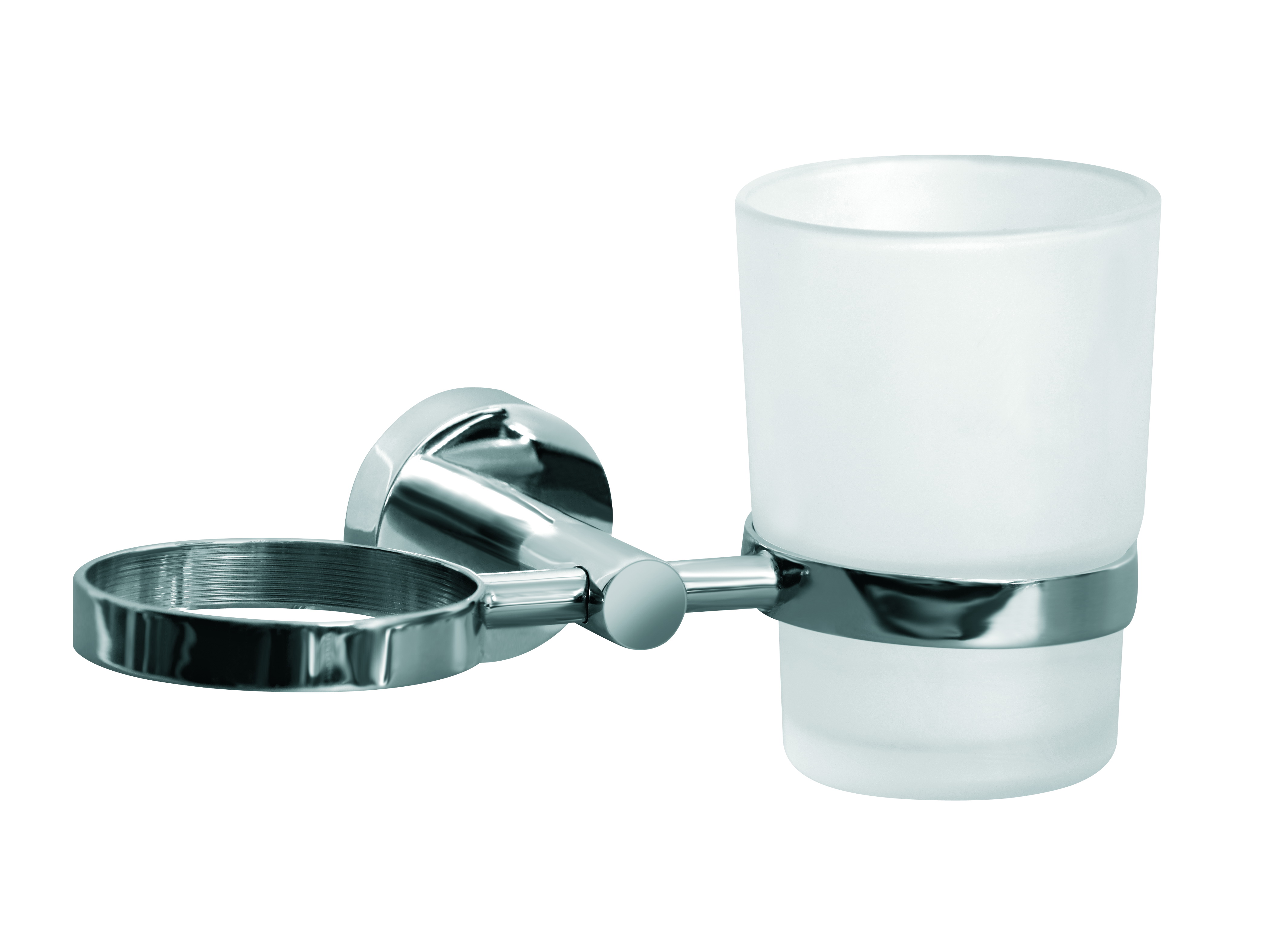 Стакан двойной с держателем. Крепится к стене шурупами или специальным двухкомпонентным клеем для металла и керамики. Произведено из цинкоалюминиевого сплава, покрытого хромом, и матового стекла.