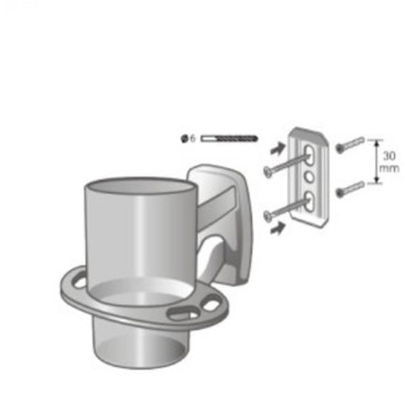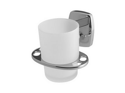 Стакан с подставкой для щеток. Крепится к стене шурупами. Произведено из цинкоалюминиевого сплава, покрытого хромом, и матового стекла.