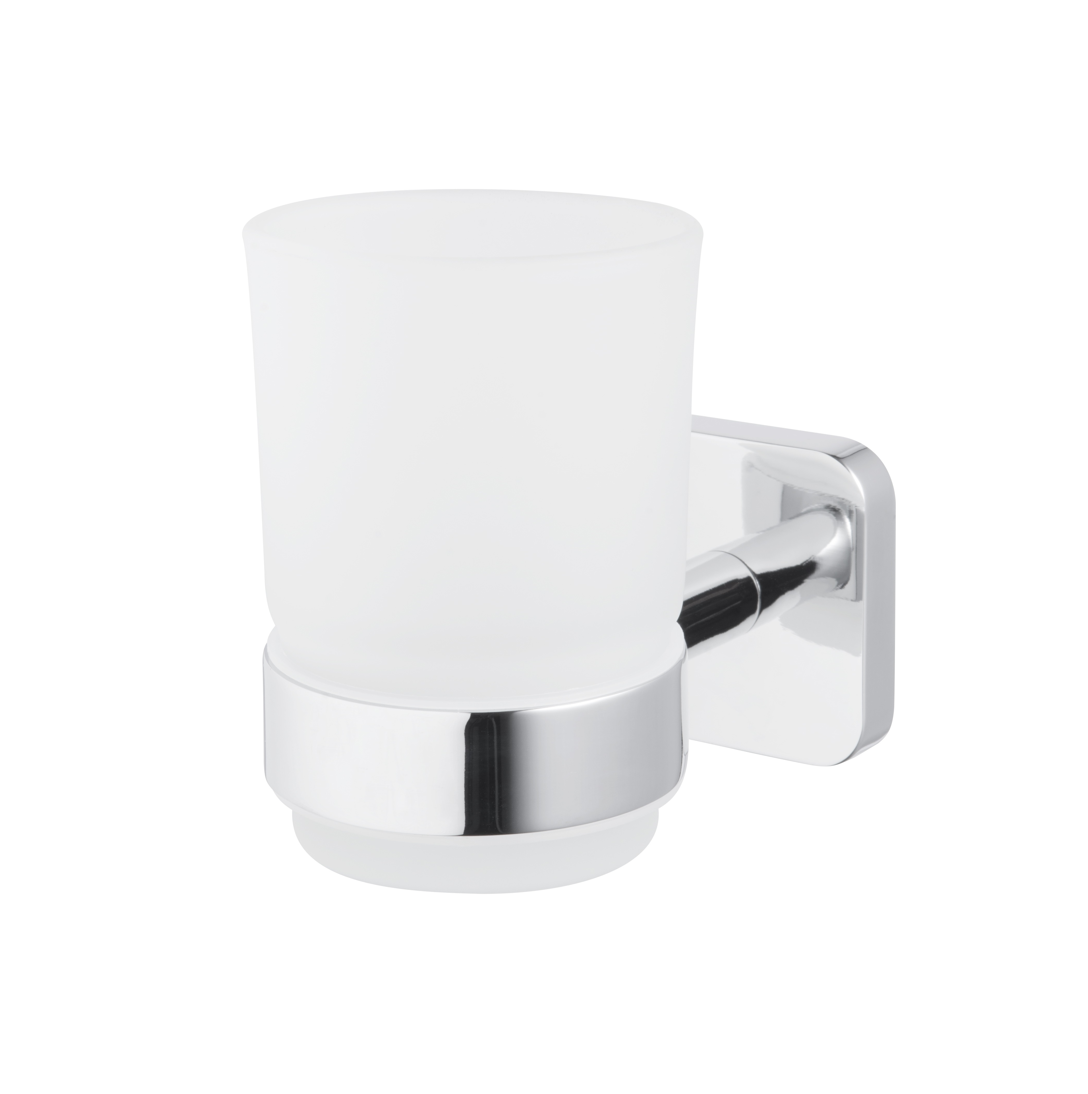 Стакан одинарный с держателем. Крепится к стене шурупами или специальным двухкомпонентным клеем для металла и керамики (в комплекте). Произведено из цинкоалюминиевого сплава, покрытого хромом, и матового стекла.
