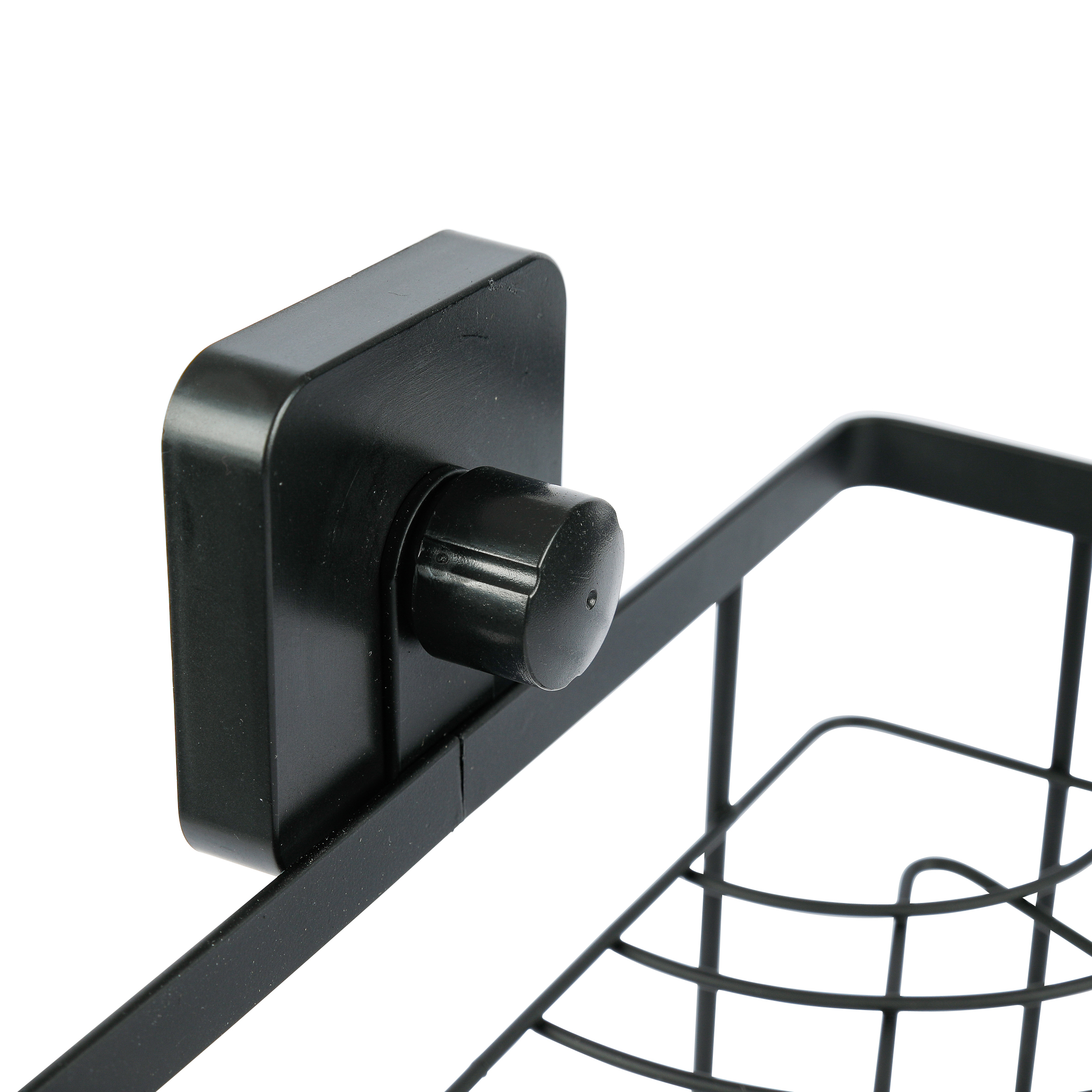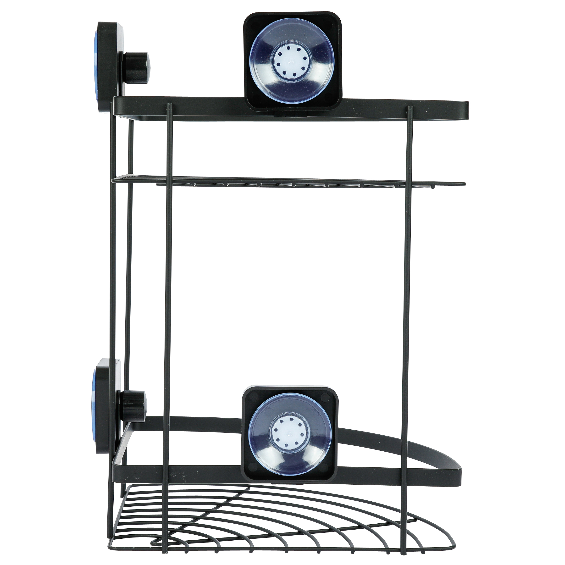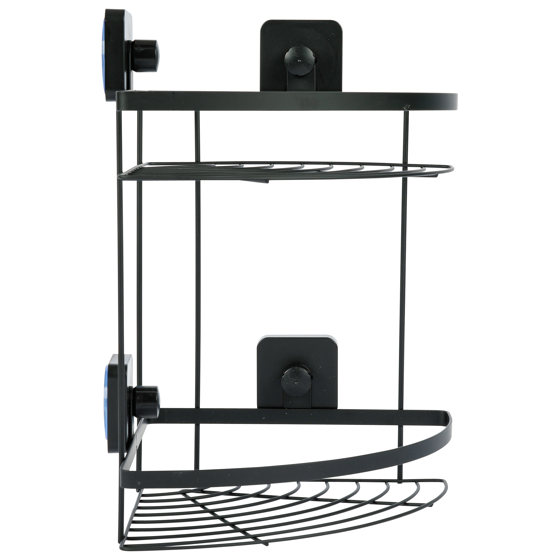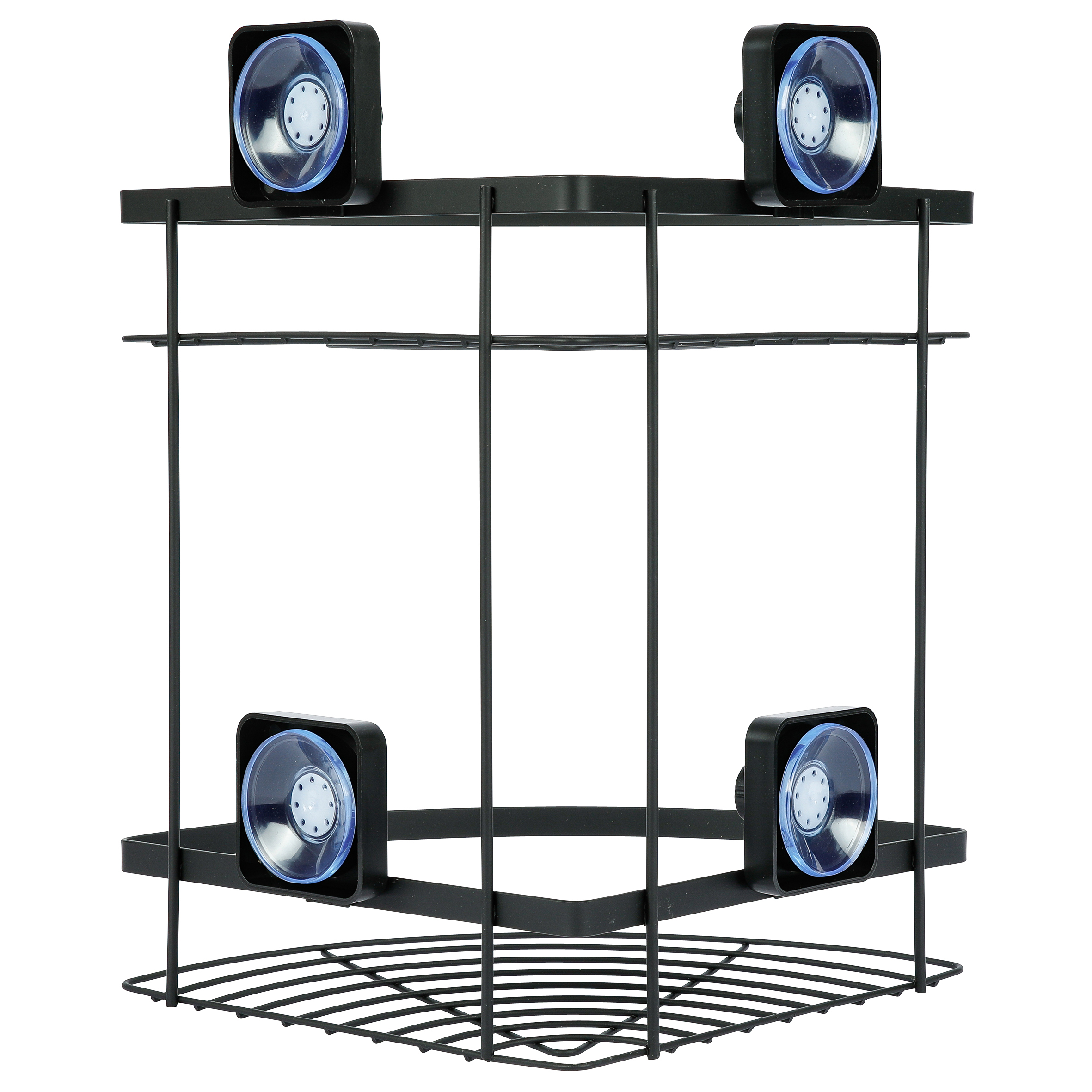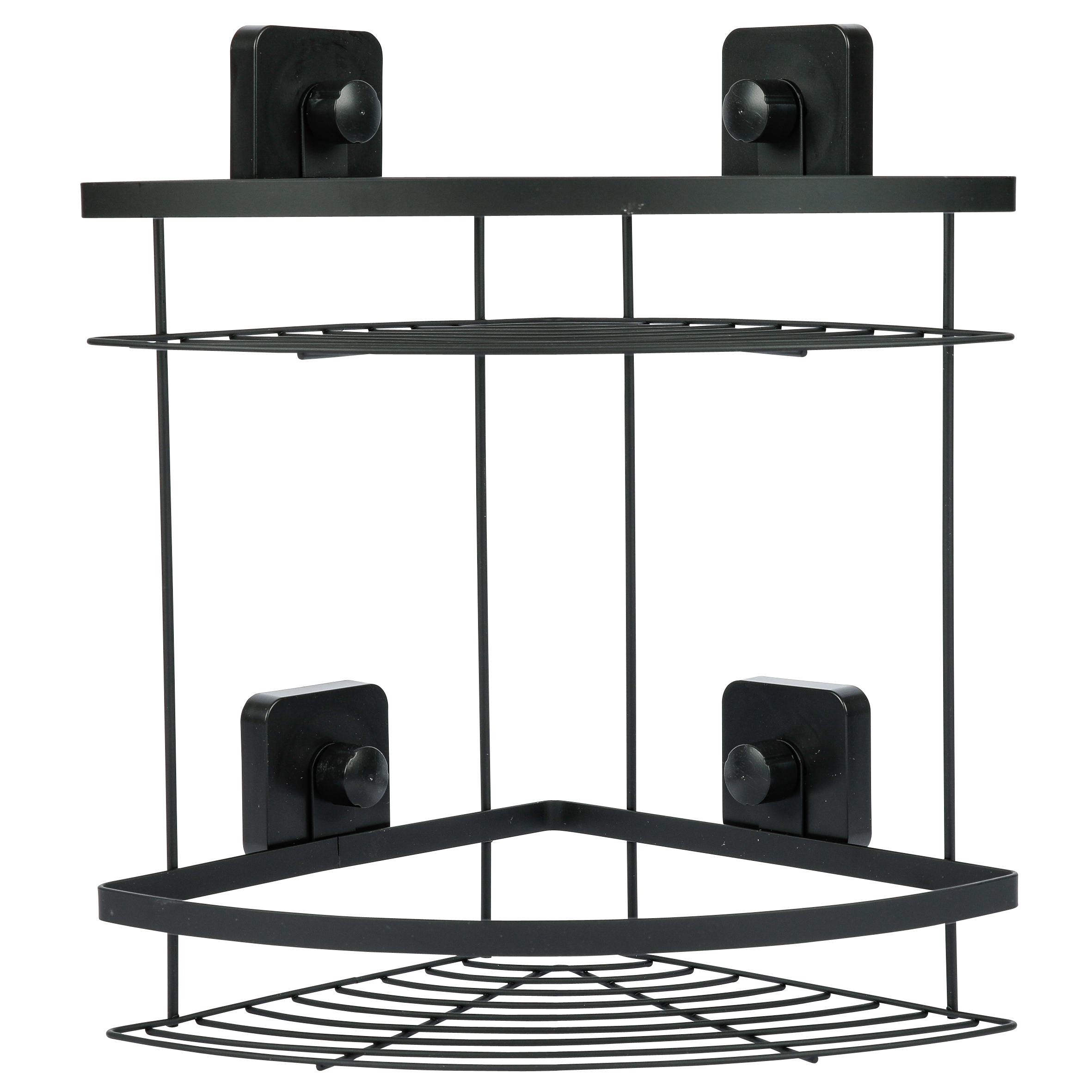 Полка угловая подвесная двухуровневая. Произведено из стального сплава с порошковым покрытием. Цвет черный. Максимальная нагрузка 2 кг на каждую полку. Крепится на гладкую сухую поверхность при помощи присосок, которые спрятаны за «колпачками» черного цвета. Перед использованием рекомендуется не загружать полку 24 часа.