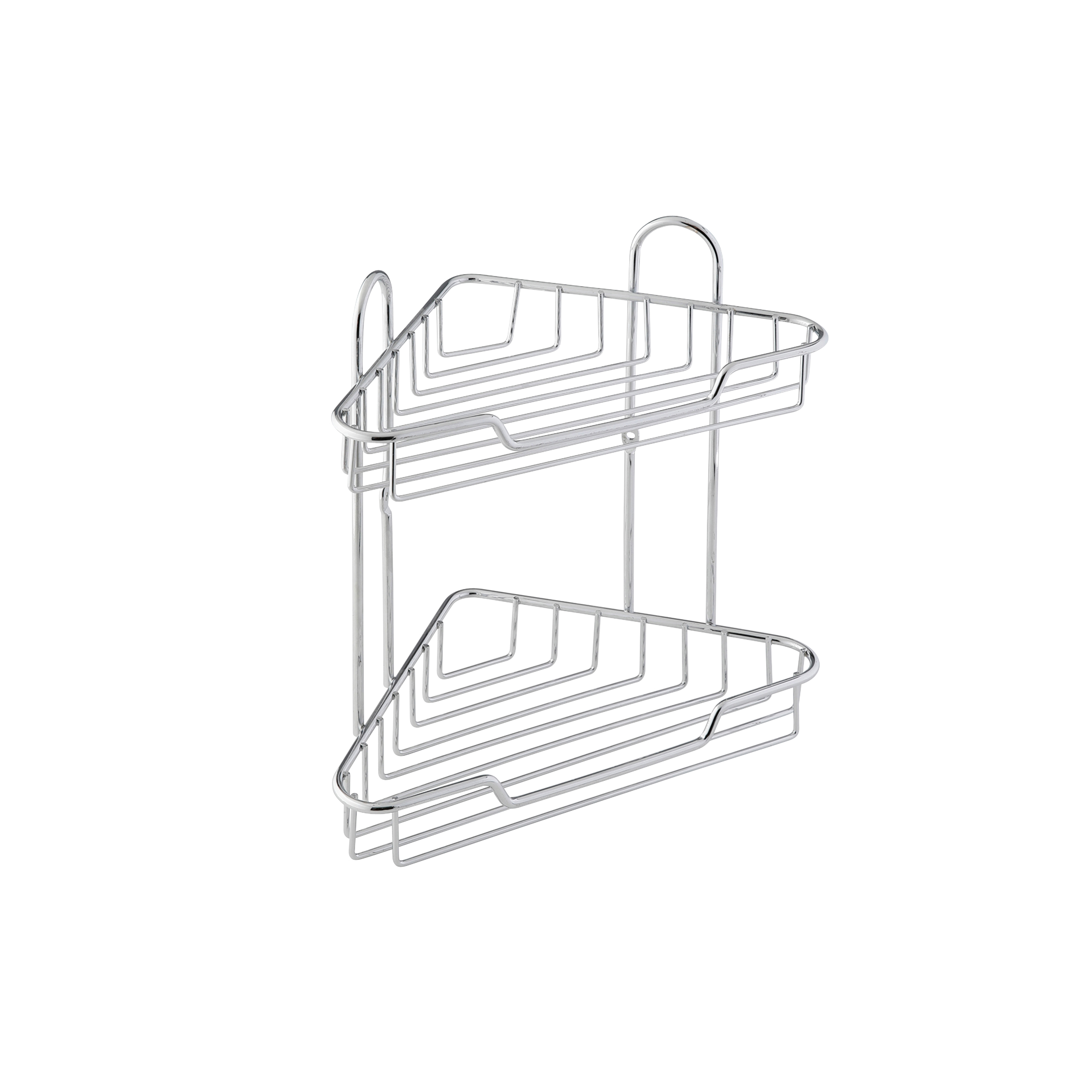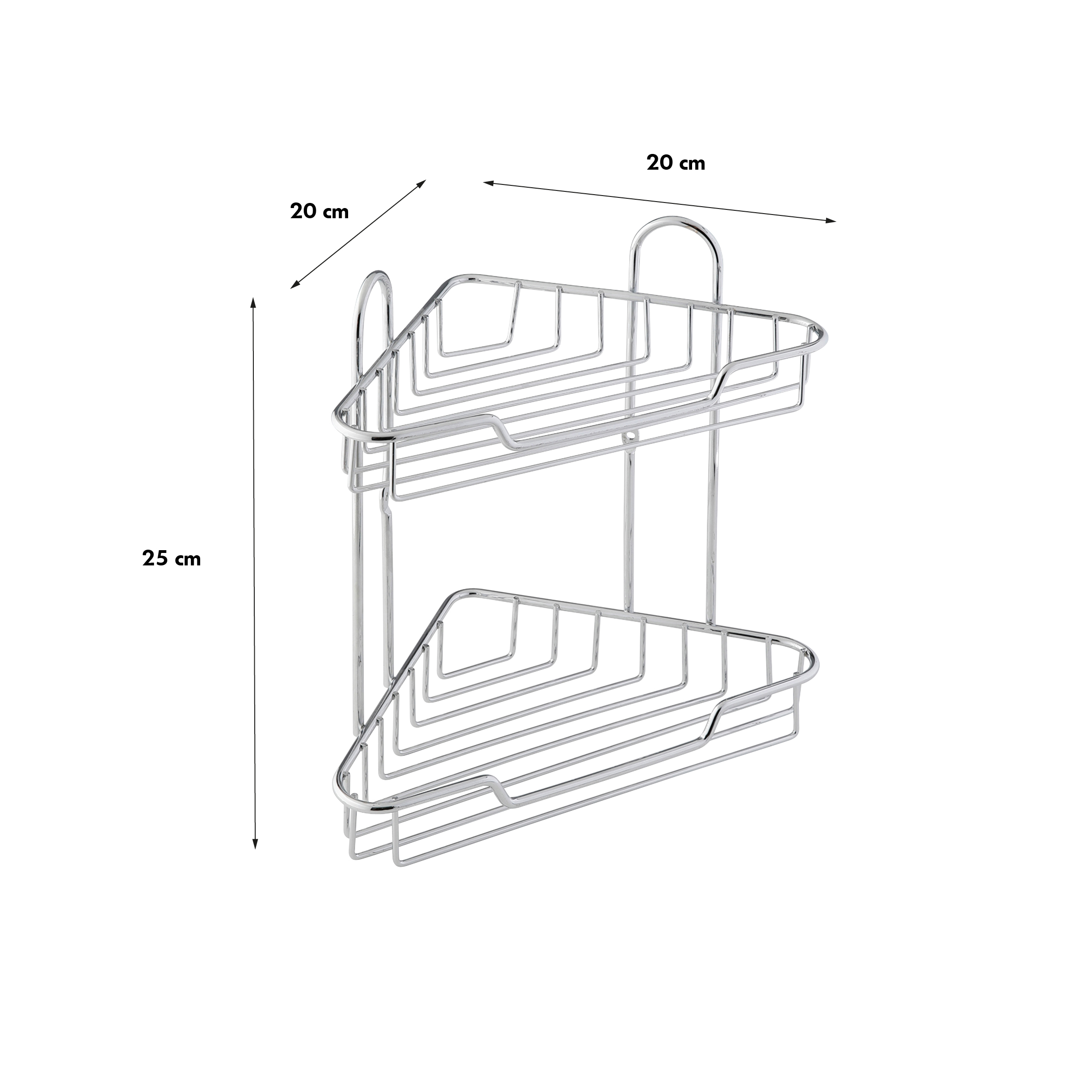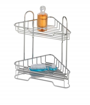 Полка подвесная угловая двухуровневая. Крепится к стене шурупами. Произведено из стального сплава, покрытого хромом. Крепеж в комплекте. Максимальная нагрузка 4кг.