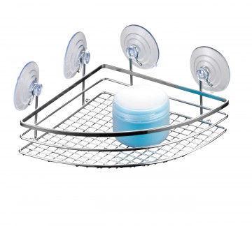 Полка подвесная угловая. Произведено из хромированной стали. Крепится на гладкую поверхность при помощи присосок. Есть возможность крепления к стене шурупами. Крепеж в комплекте. Максимальная нагрузка 3кг.