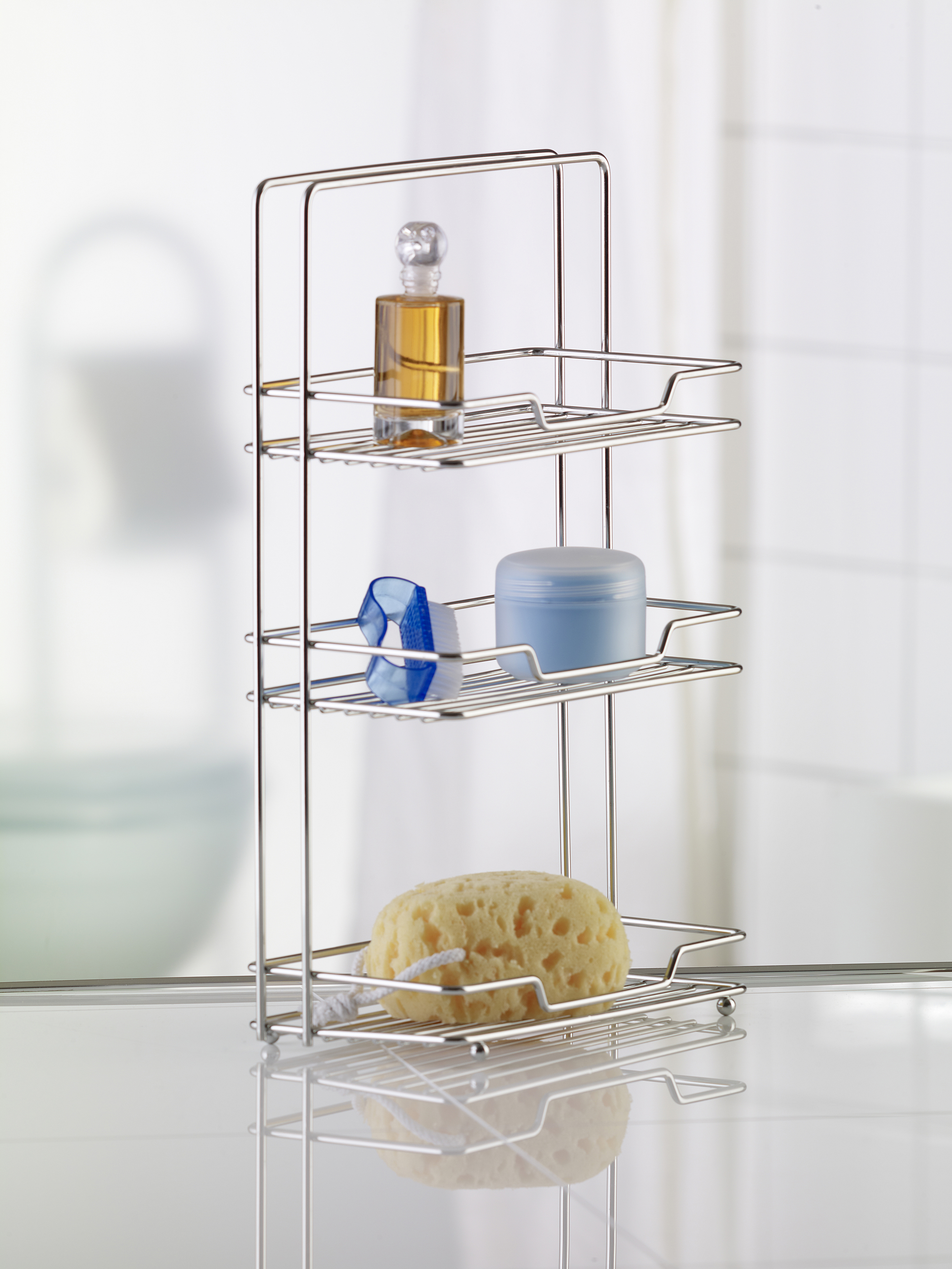 Полка подвесная трехуровневая. Максимальная нагрузка 6кг. Крепится к стене шурупами. Произведено из стального сплава, покрытого хромом.