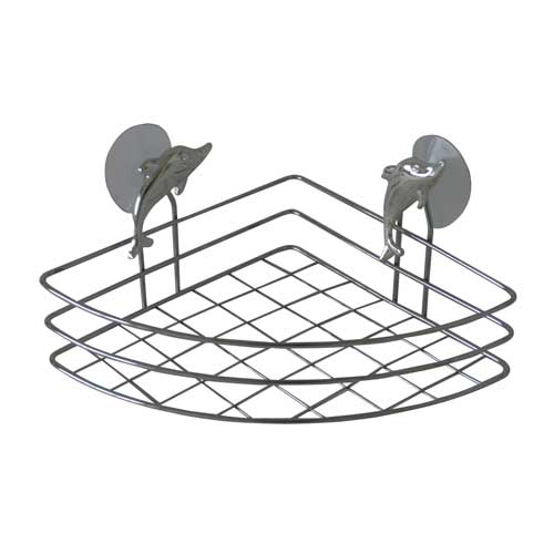 Полка угловая. Крепится на гладкую поверхность при помощи присосок. Произведено из хромированной стали с пластиковыми элементами.