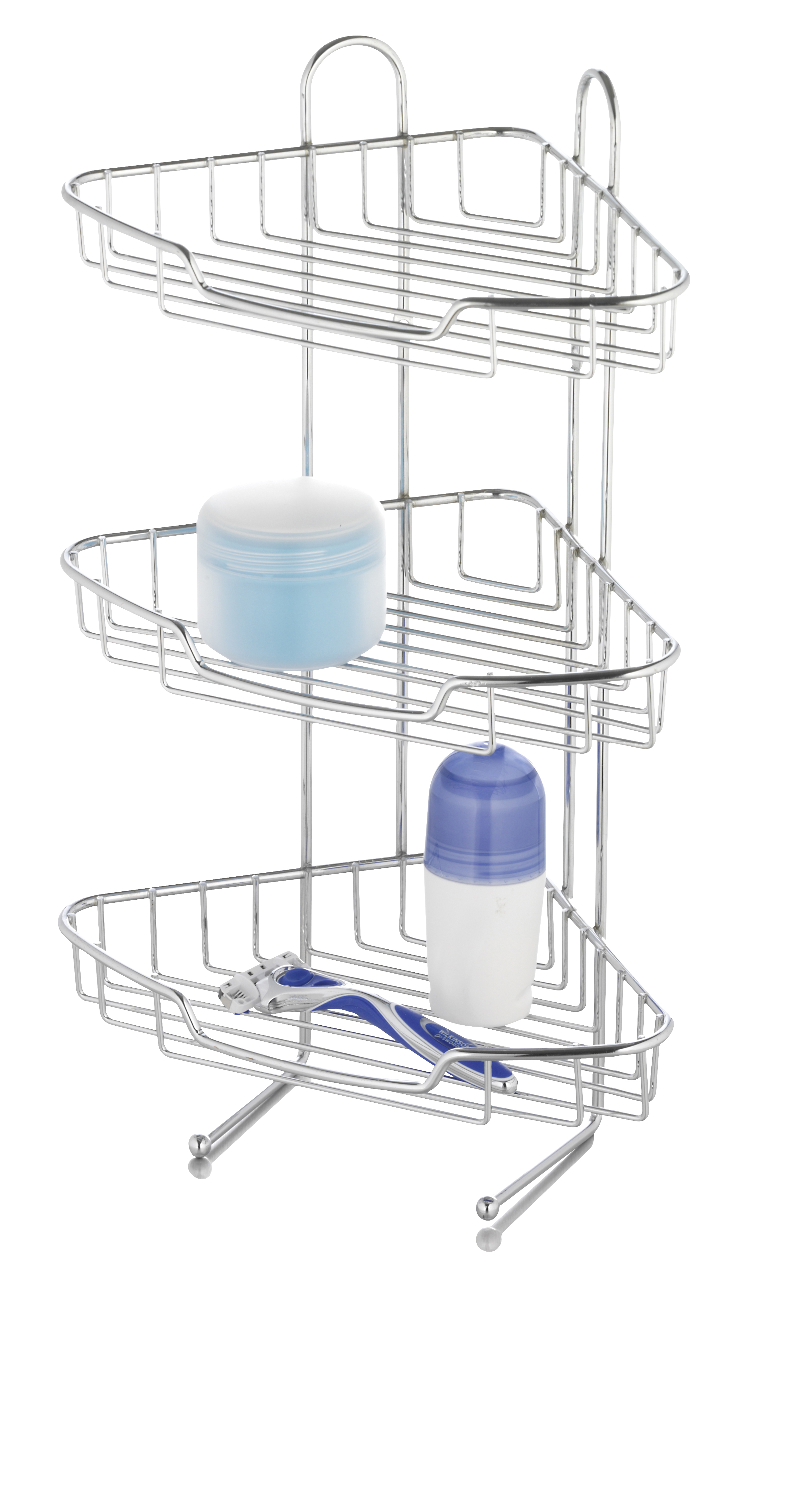 Полка подвесная угловая трехуровневая. Дополнительно имеются два крючка. Крепится к стене шурупами. Произведено из стального сплава, покрытого хромом. Максимальная нагрузка 6кг. Крепеж в комплекте.
