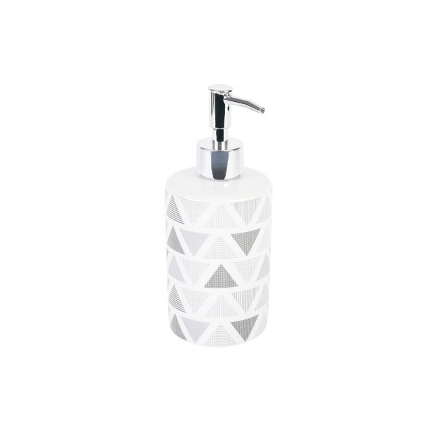 Дозатор для жидкого мыла. Объем 330мл. Произведено из керамики. Носик дозатора изготовлен из пластика, покрытого хромом. Цвет серый. Глянцевая поверхность с рисунком.