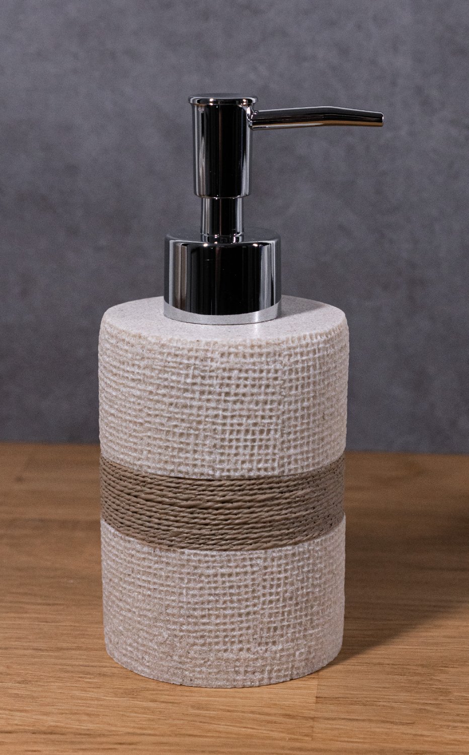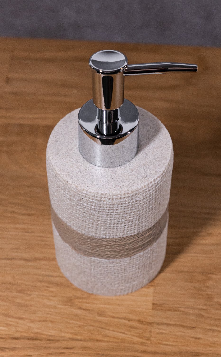 Дозатор для жидкого мыла. Произведено из полирезина и пластика, покрытого хромом. Цвет светло-бежевый с акцентной полосой по центру.
