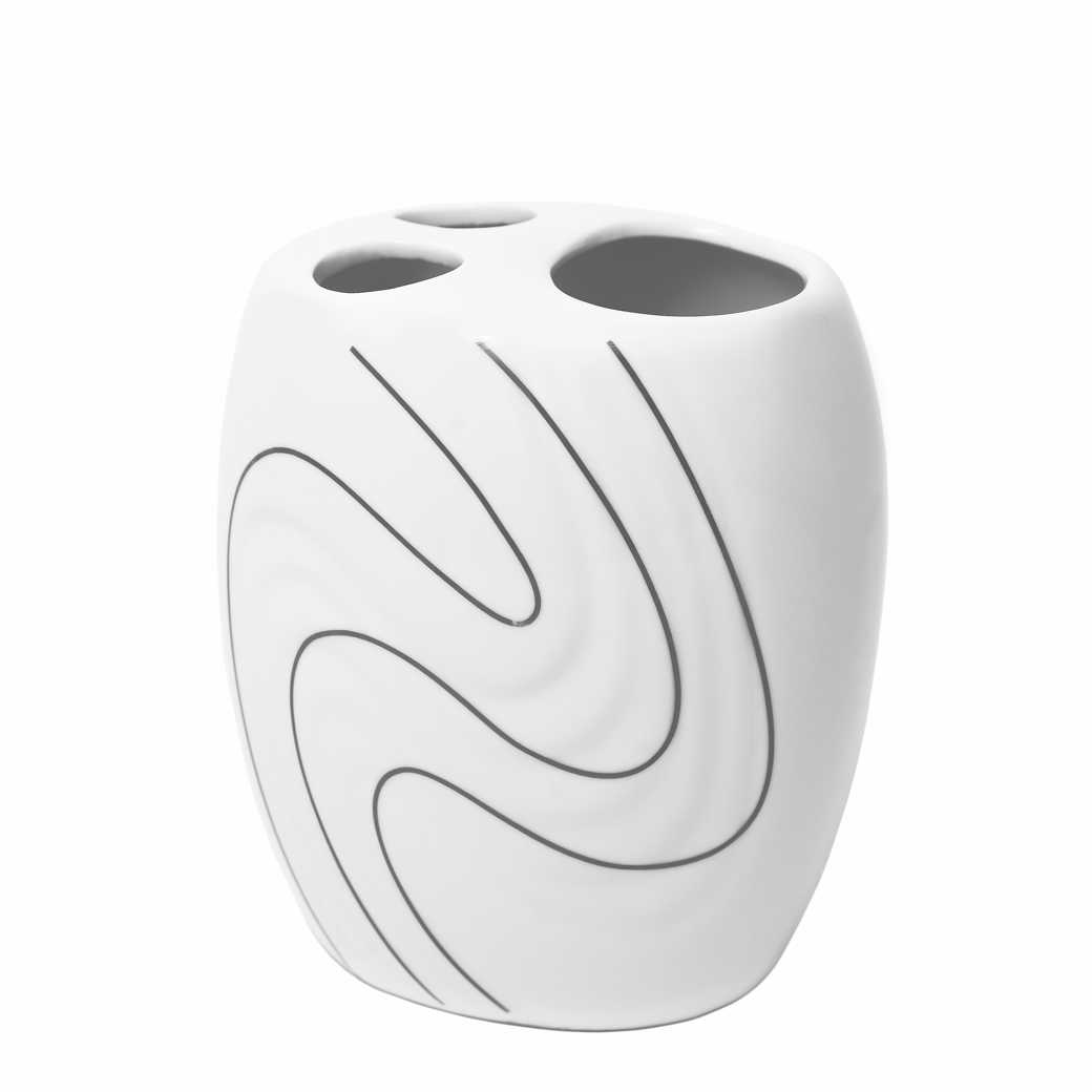 Стакан для зубных щеток. Произведено из керамики. Цвет белый. Глянцевая поверхность с серебристым рисунком.