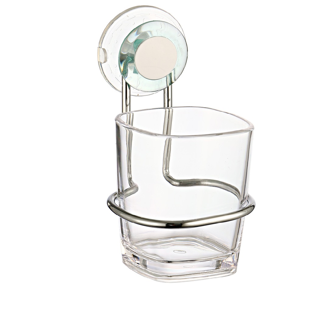 Стакан косметический. Прозрачный, с элементами белого и светло-зеленого цветов. Крепится на гладкую поверхность при помощи присоски. Произведено из пластика и хромированной стали.