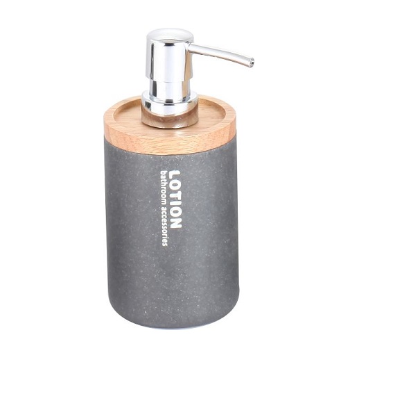Дозатор для жидкого мыла. Произведено из полирезина, пластика, покрытого хромом, и дерева. Цвет серый. Матовая поверхность.
