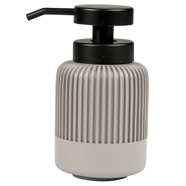 Дозатор для жидкого мыла. Объем 250мл. Произведено из полирезина, носик черный пластиковый. Поверхность частично с рельефными полосками. Цвет темно-серый.