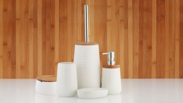 Щетка для унитаза. Произведено из керамики, бамбука и стального сплава, покрытого хромом. Цвет белый. Глянцевая поверхность с рельефной надписью. Головка щетки черного цвета.