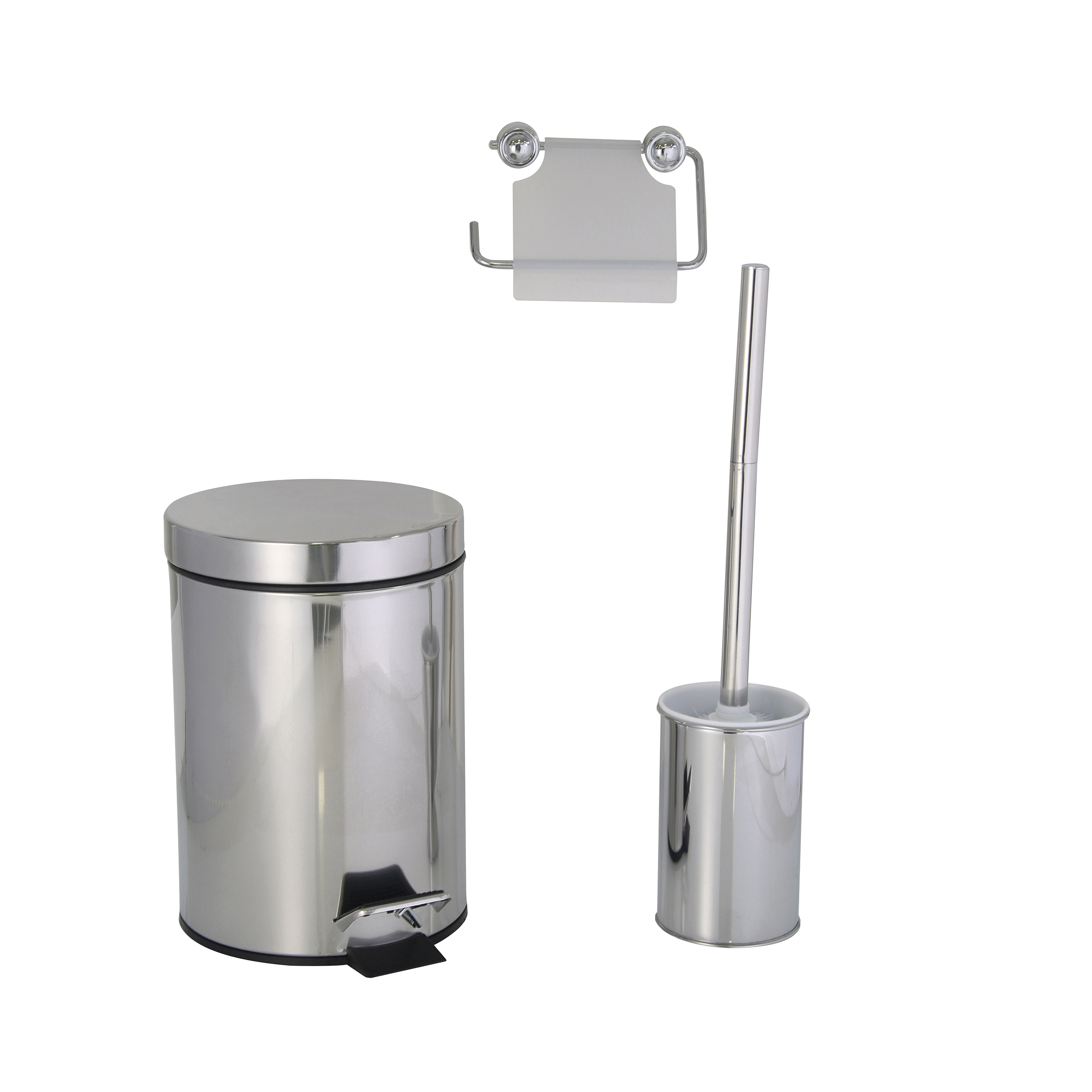 Комплект: ведро с педалью объем 3 литра (d170 мм, H240 мм), щетка для унитаза (d90 мм, H390 мм) и держатель туалетной бумаги с прозрачной крышкой (150*120 мм). Держатель крепится к стене шурупами. Произведено из хромированной стали и пластика.