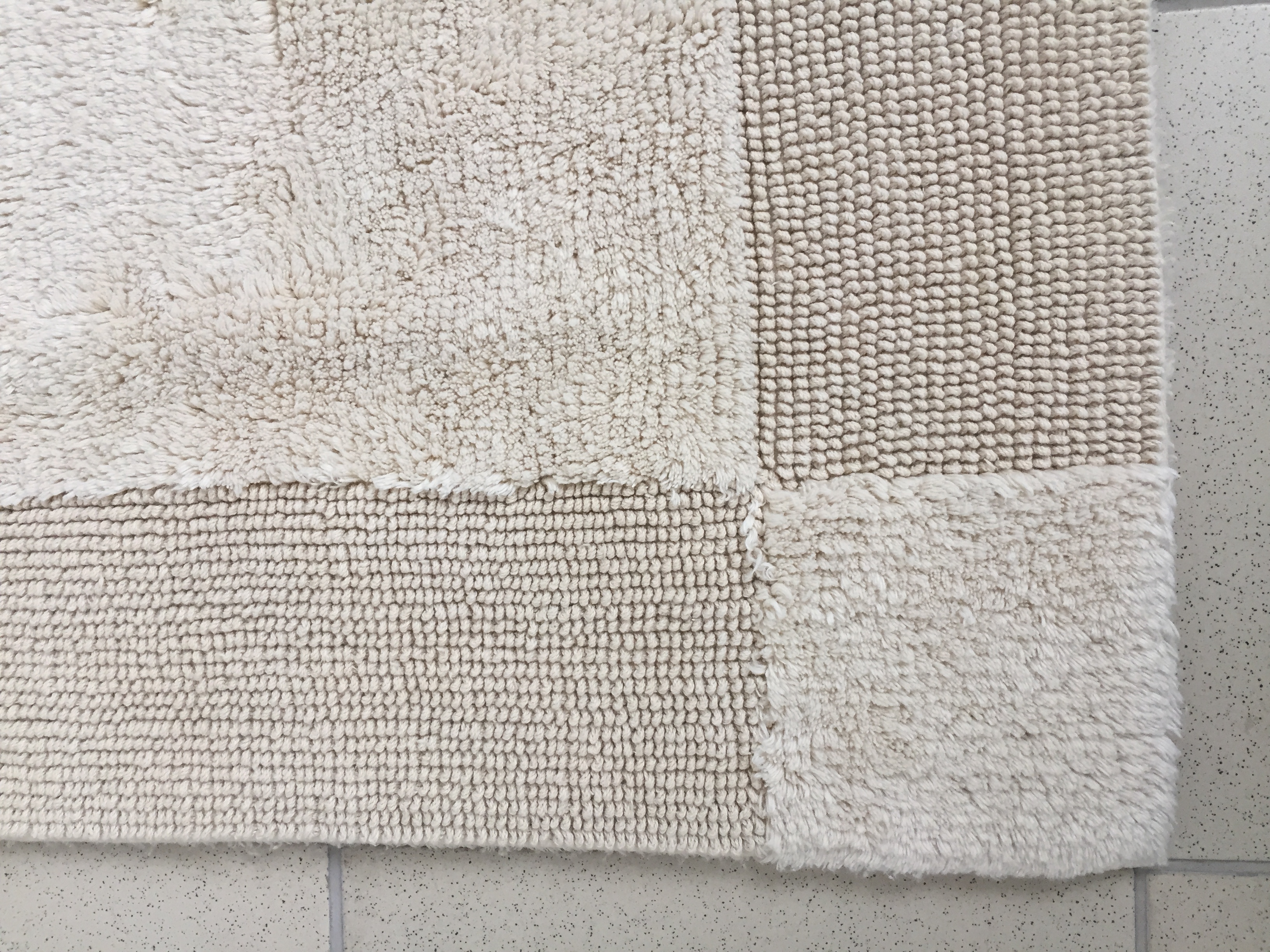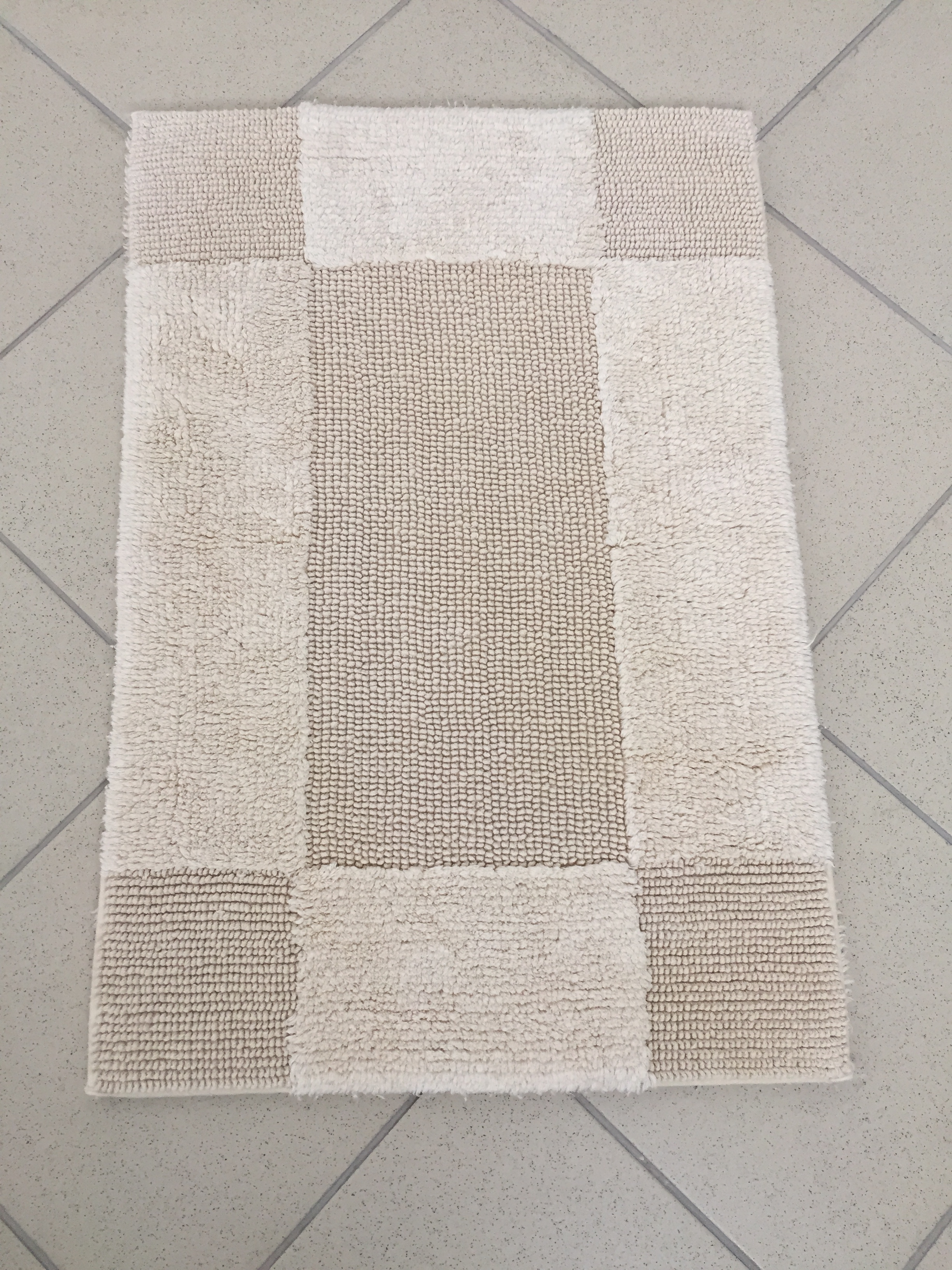 Коврик для ванной комнаты. Материал - 100% хлопок. Цвет кремовый. Двухсторонний рисунок. Основные преимущества – практичность, долговечность, простота ухода, экологичность. Качество материала позволяет на протяжении длительного времени сохранять первоначальную форму, цвет и высоту ворса коврика. Для сохранения мягкости нитей ткани рекомендуется ручная или машинная стирка с добавлением смягчающих средств. С целью избежания деформации коврик следует сушить на плоской поверхности. Может использоваться не только в ванной комнате, но и в других помещениях. Допустимо размещение на подогреваемых полах.