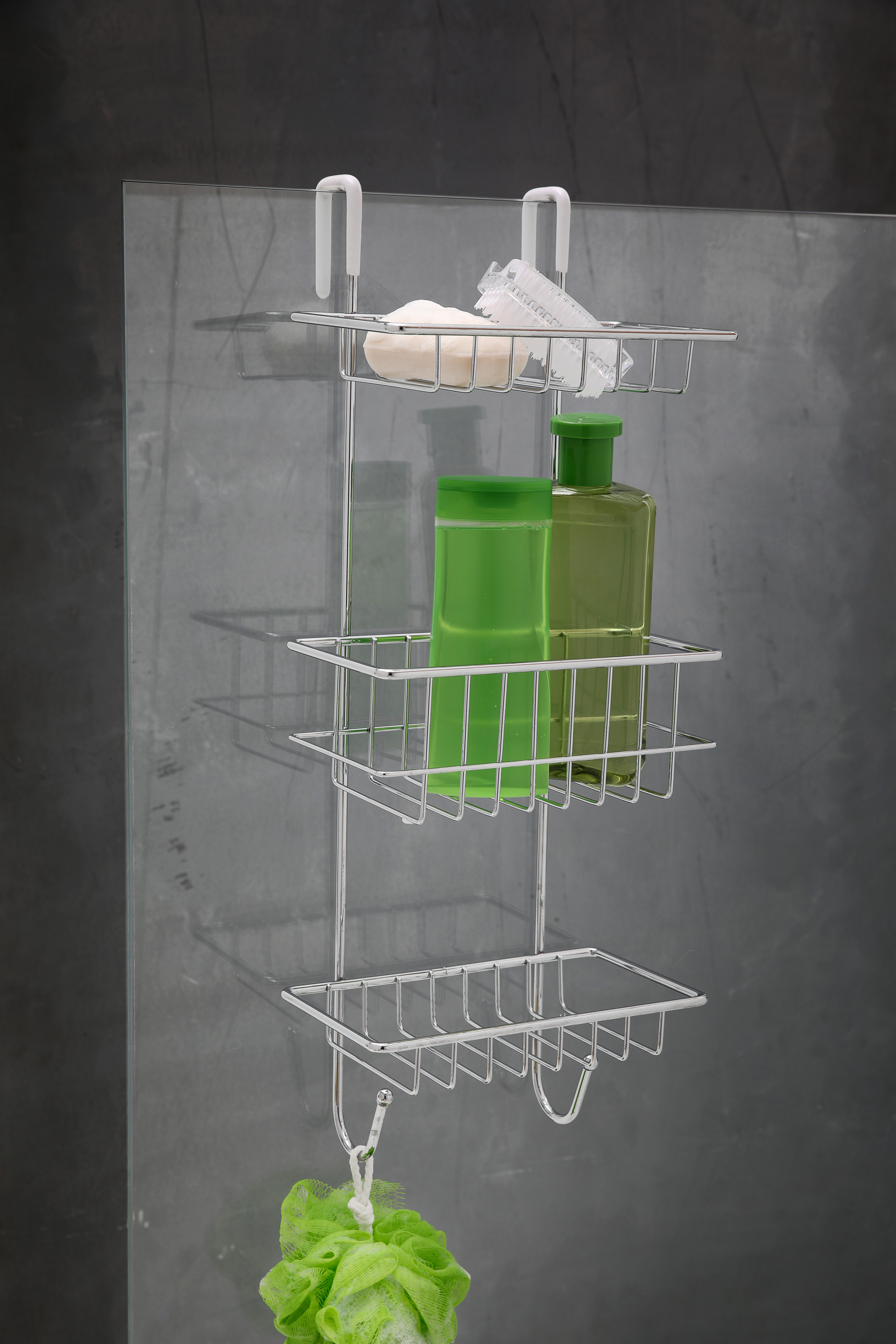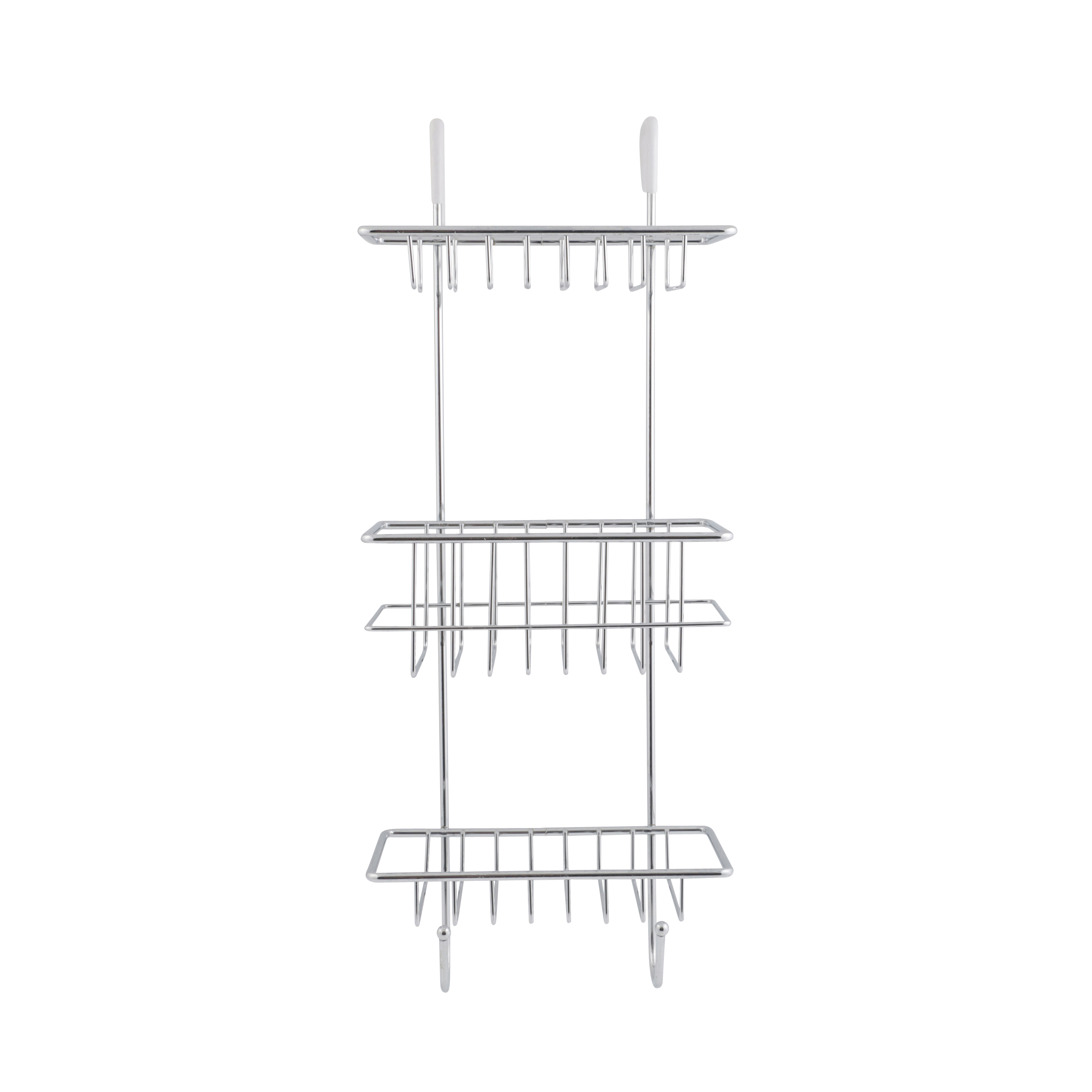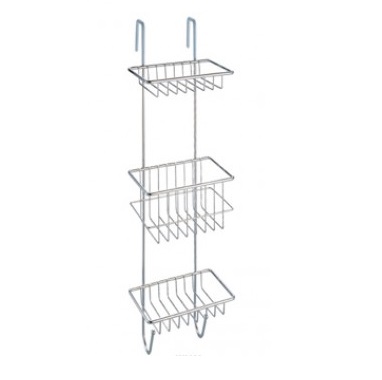 Полка подвесная трехуровневая с двумя крючками. Крепится к стене шурупами. Размеры полок: 175*220*570 мм, 130*220*90 мм, 130*220*30 мм. Произведено из хромированной стали.