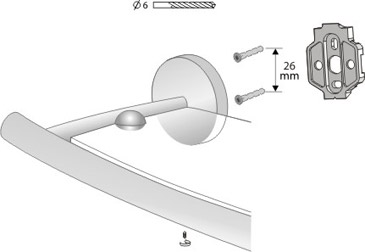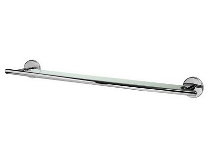 Полка под зеркало. Крепится к стене шурупами или специальным двухкомпонентным клеем для металла и керамики. Произведено из цинкоалюминиевого сплава, покрытого хромом, и матового стекла.