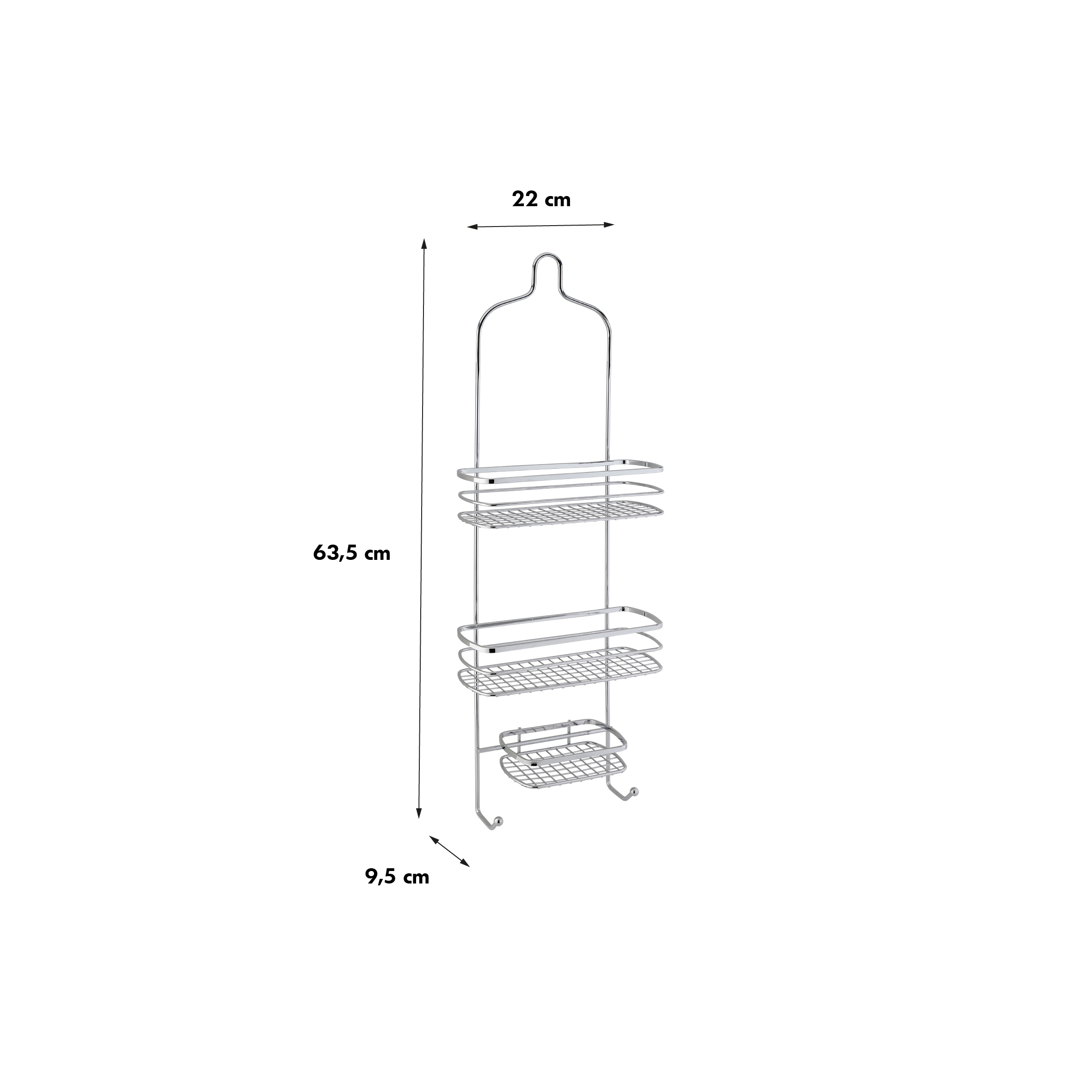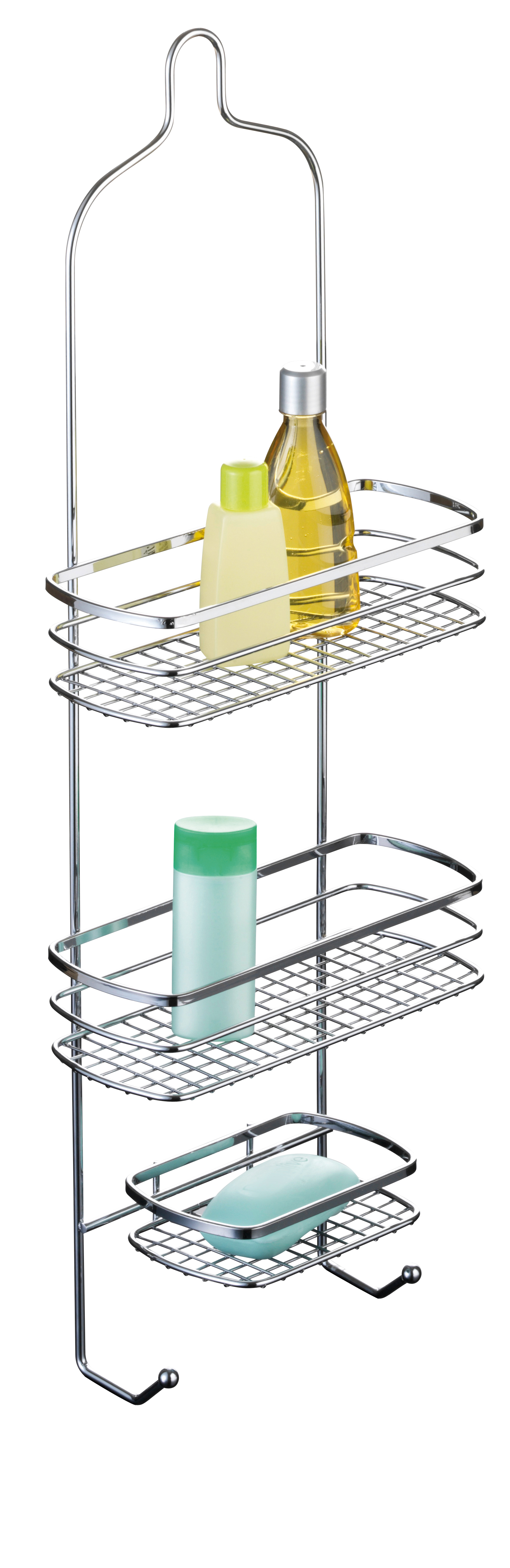 Полка подвесная трехуровневая с двумя крючками. Крепится к стене шурупами. Произведено из хромированной стали. Максимальная нагрузка 5кг.