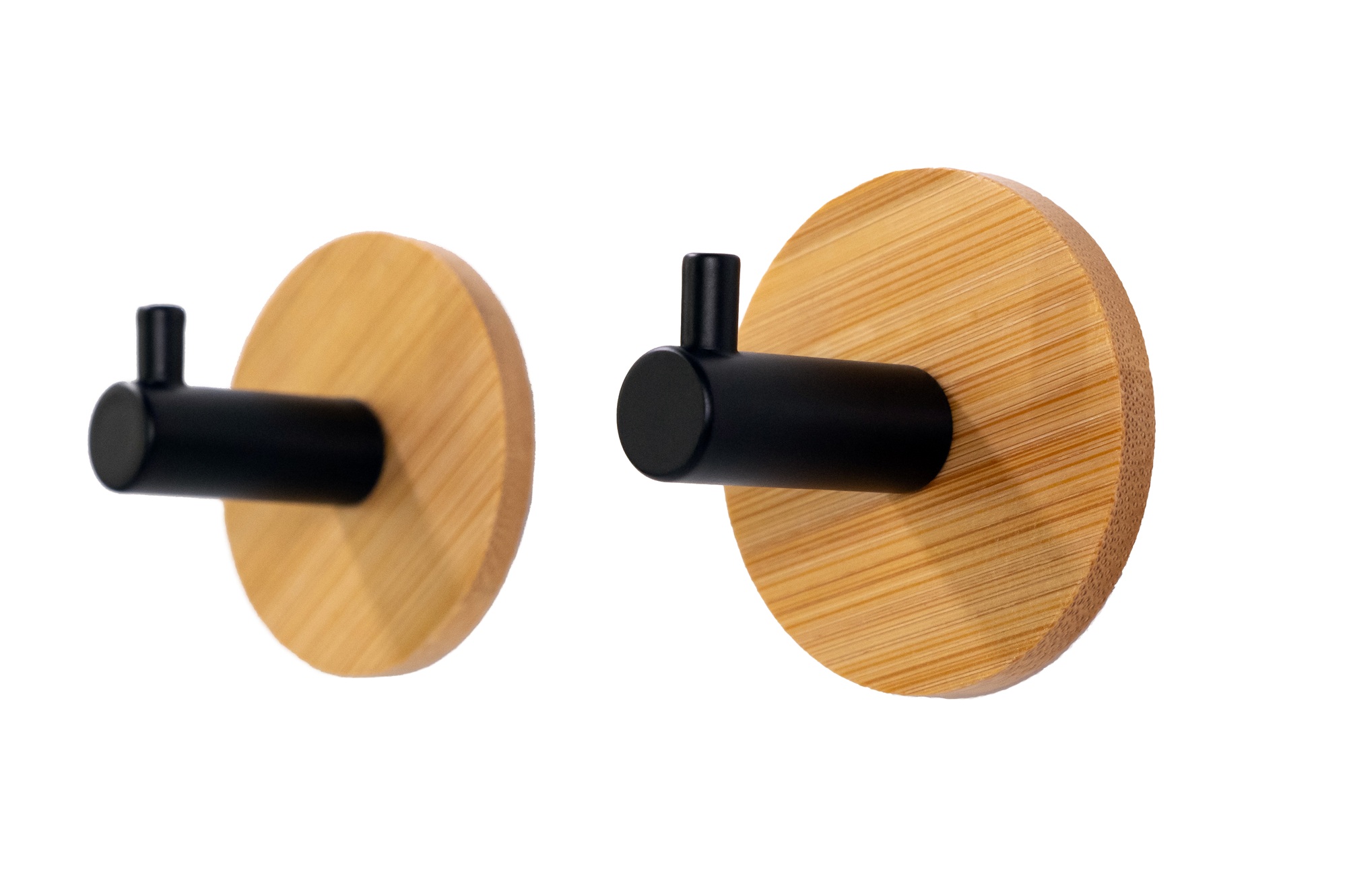Крючок круглый одинарный (комплект 2шт). Крепится на гладкую поверхность при помощи липкой ленты 3М. Произведено из металла с порошковым покрытием и бамбукового дерева. Крючок черного цвета. Поверхность матовая.