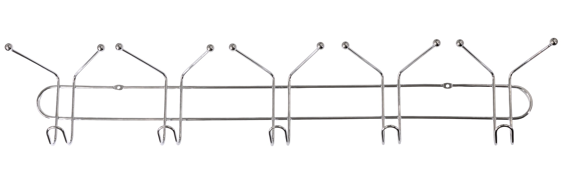 Планка с крючками. Крепится к стене шурупами. Произведено из металла, покрытого хромом.