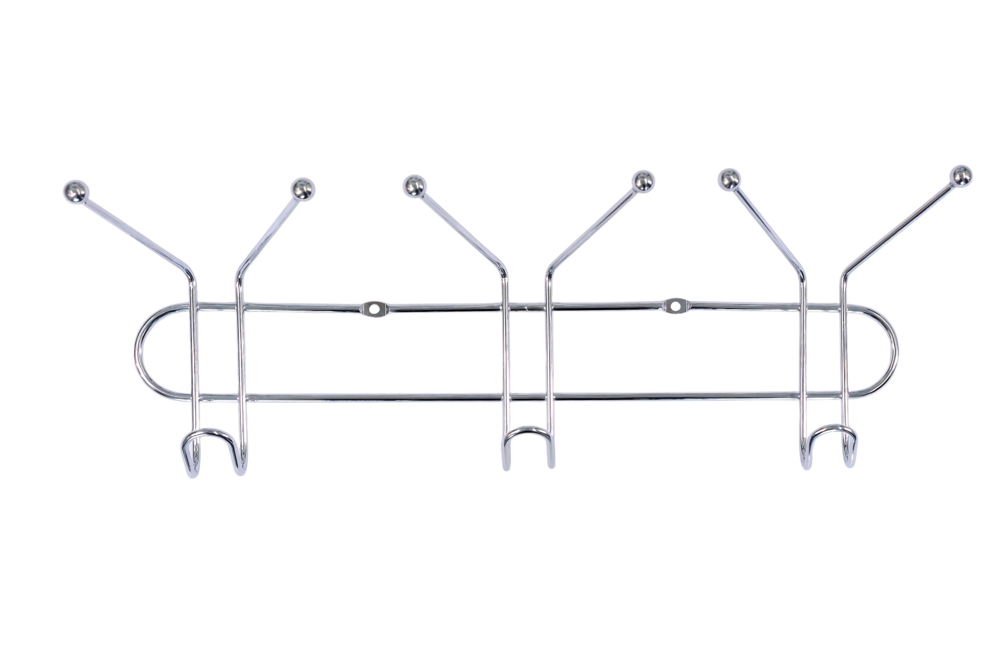 Планка с крючками. Крепится к стене шурупами. Произведено из металла, покрытого хромом.