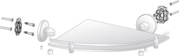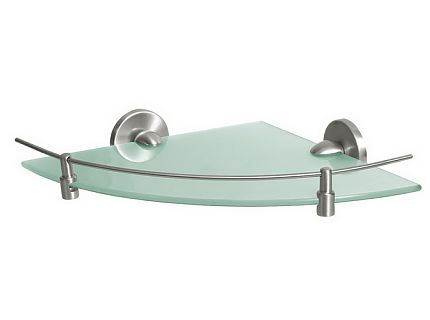 Полка угловая. Крепится к стене шурупами или специальным двухкомпонентным клеем для металла и керамики. Произведено из цинкоалюминиевого сплава с покрытием из матового никеля и матового стекла.