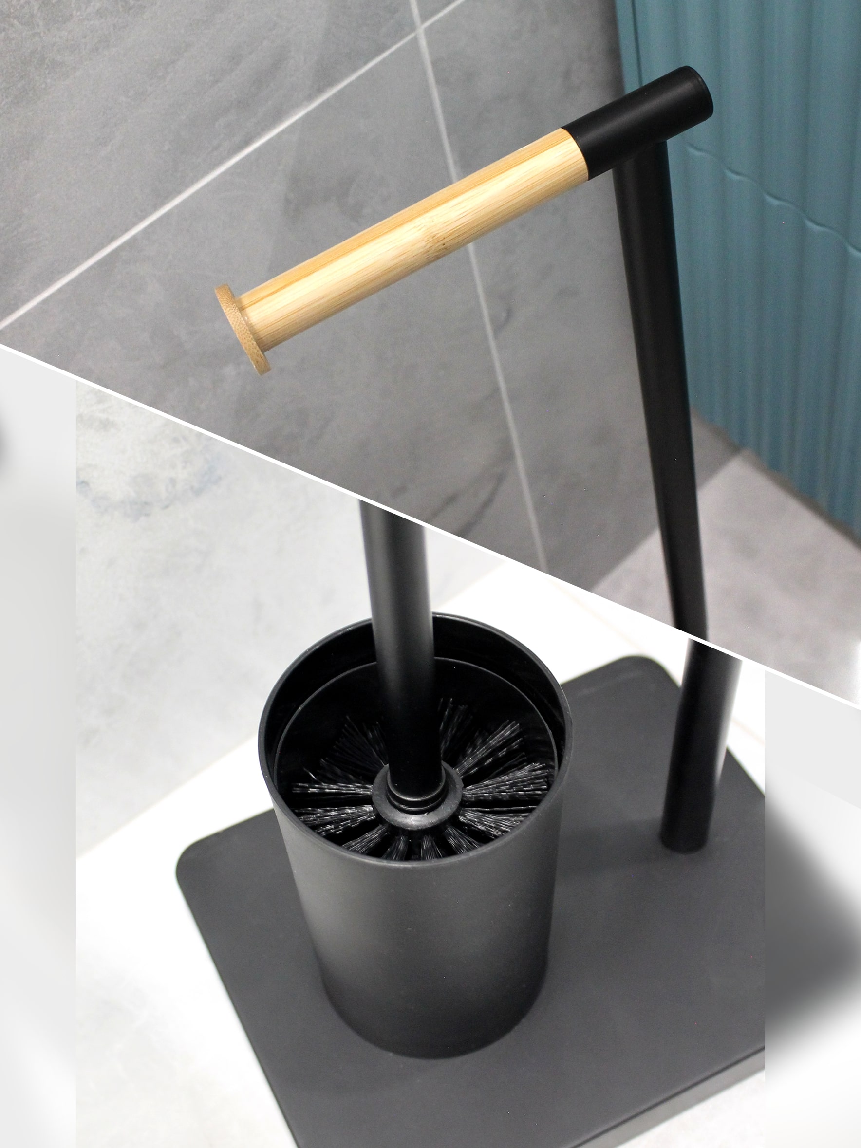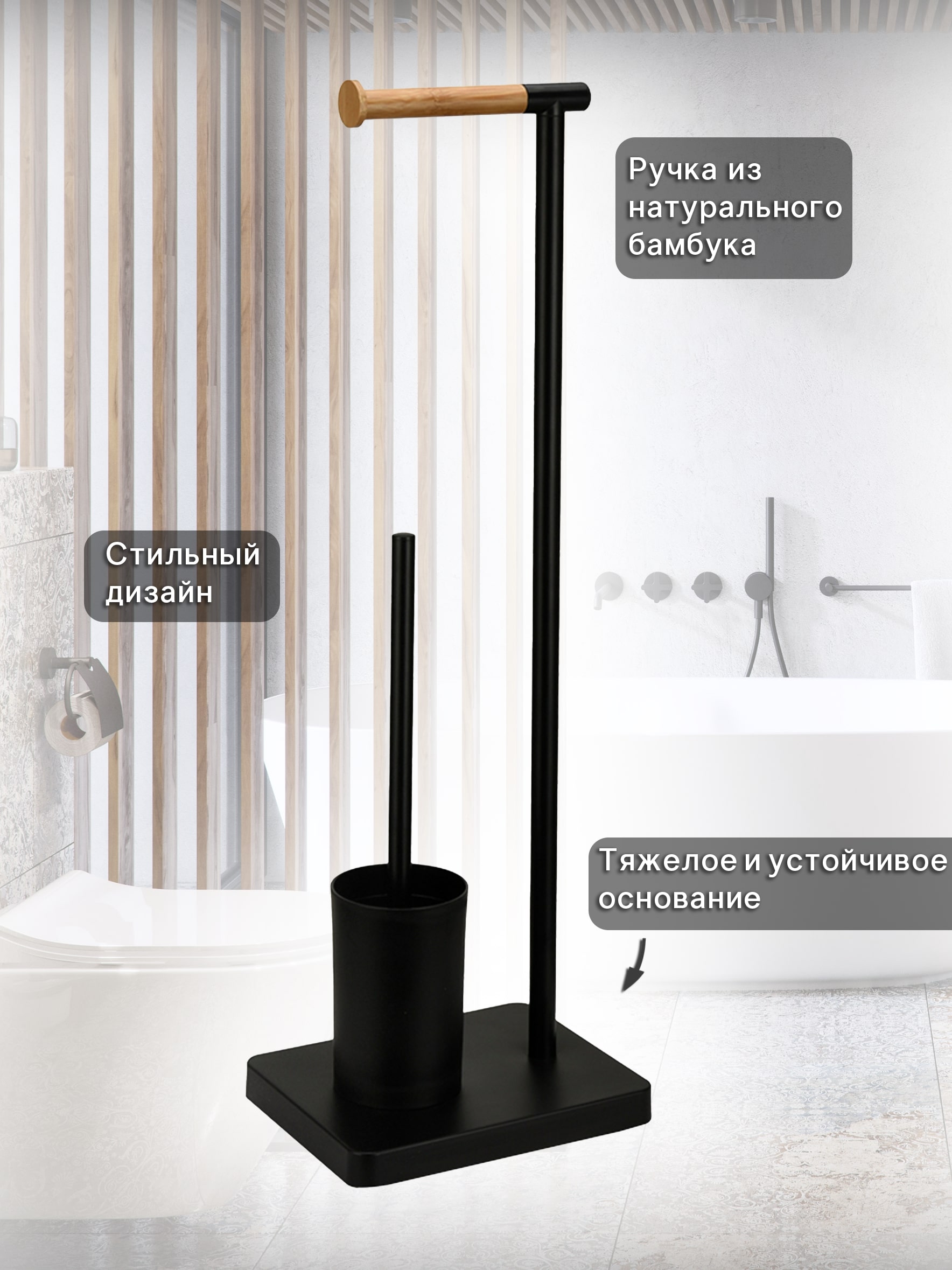 Стойка для туалета напольная. Комплект: держатель для туалетной бумаги и щетка для унитаза. Произведено из нержавеющей стали. Поверхность глянцевая. Подставка черного цвета изготовлена из пластика. Ручка бамбуковая. Стойка упакована в картонную коробку.