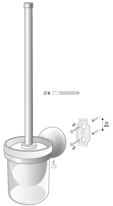 Щетка для унитаза с держателем. Крепится к стене шурупами. Произведено из цинкоалюминиевого сплава, покрытого хромом, и матового стекла.