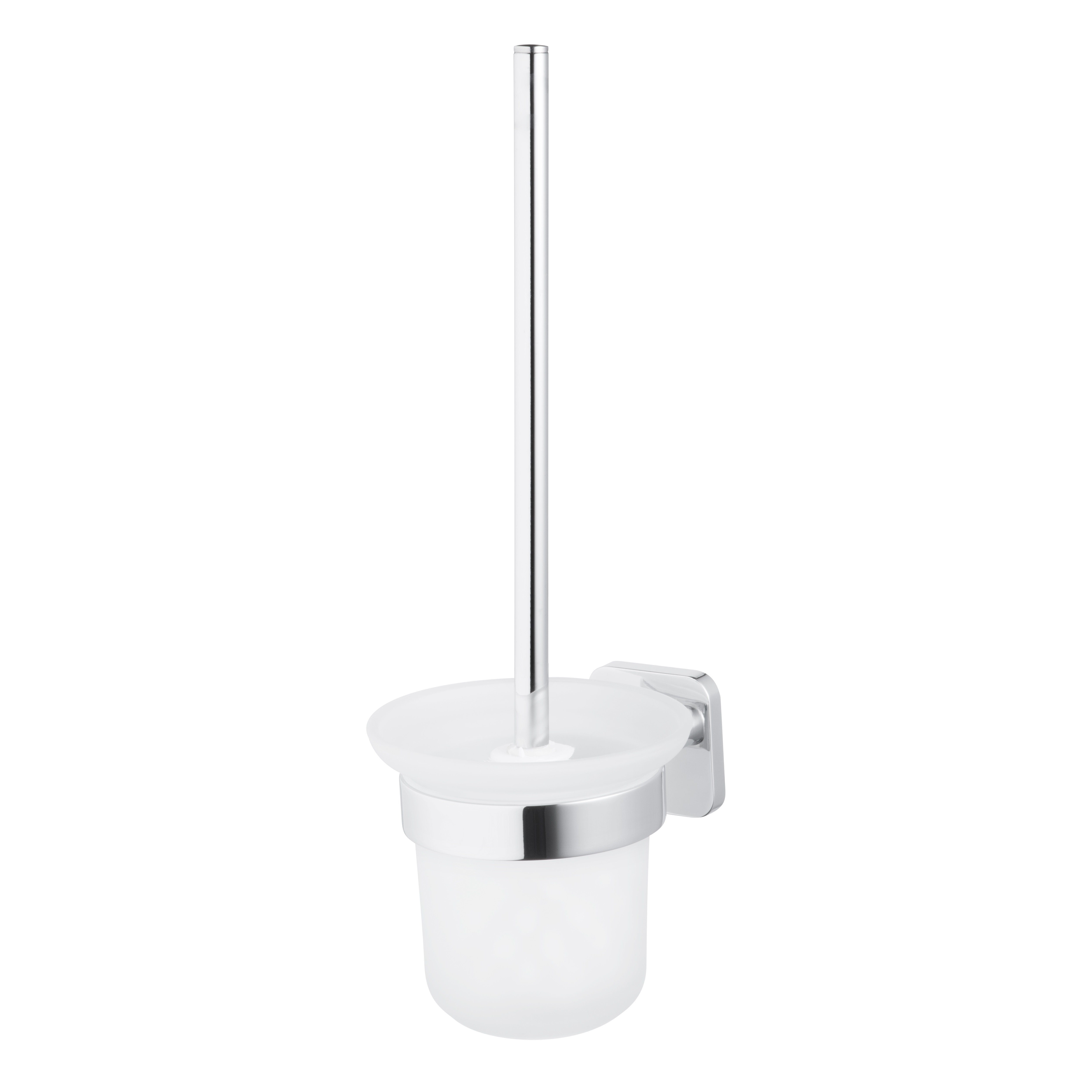Щетка для унитаза с держателем. Крепится к стене шурупами или специальным двухкомпонентным клеем для металла и керамики (в комплекте). Произведено из цинкоалюминиевого сплава, покрытого хромом, и матового стекла.