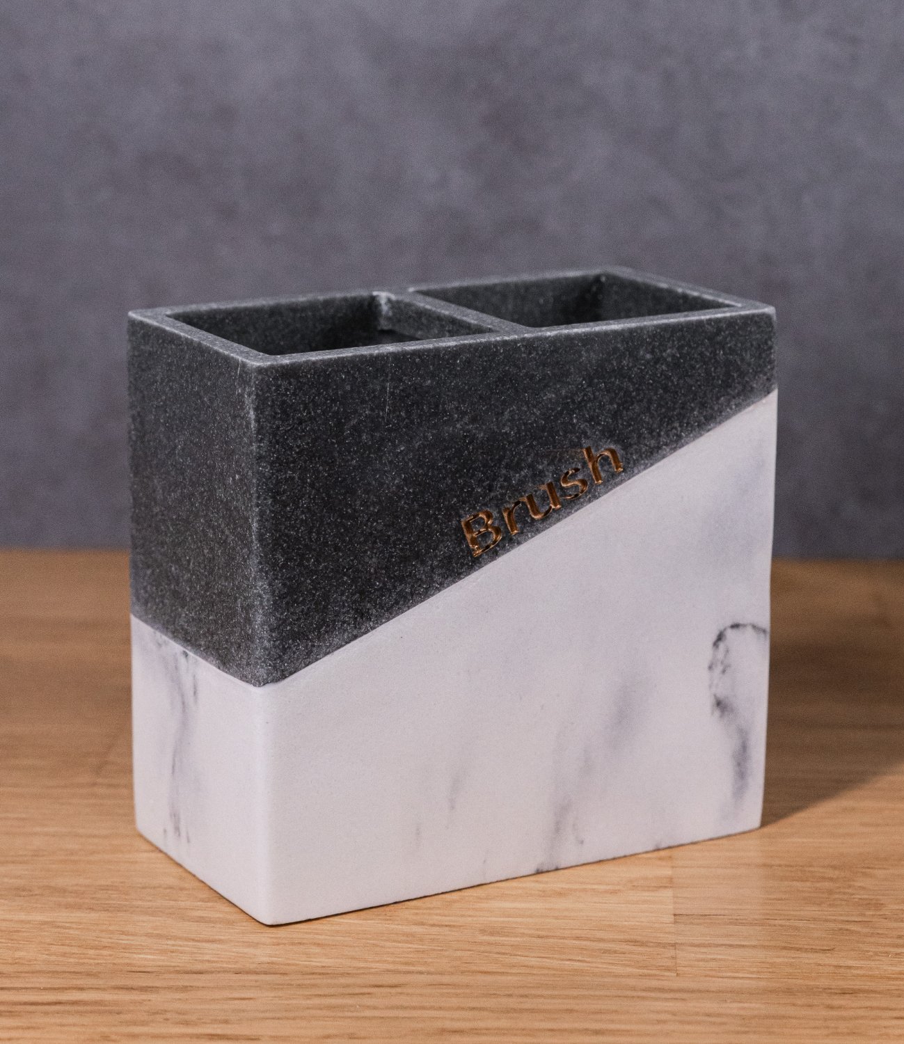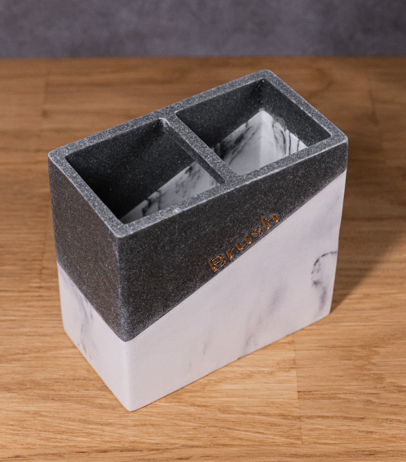 Стакан для зубных щеток и пасты. Разделен на два отсека. Произведено из полирезина. Цвет комбинированный: верхняя часть стакана серого цвета, нижняя часть - имитация мрамора.