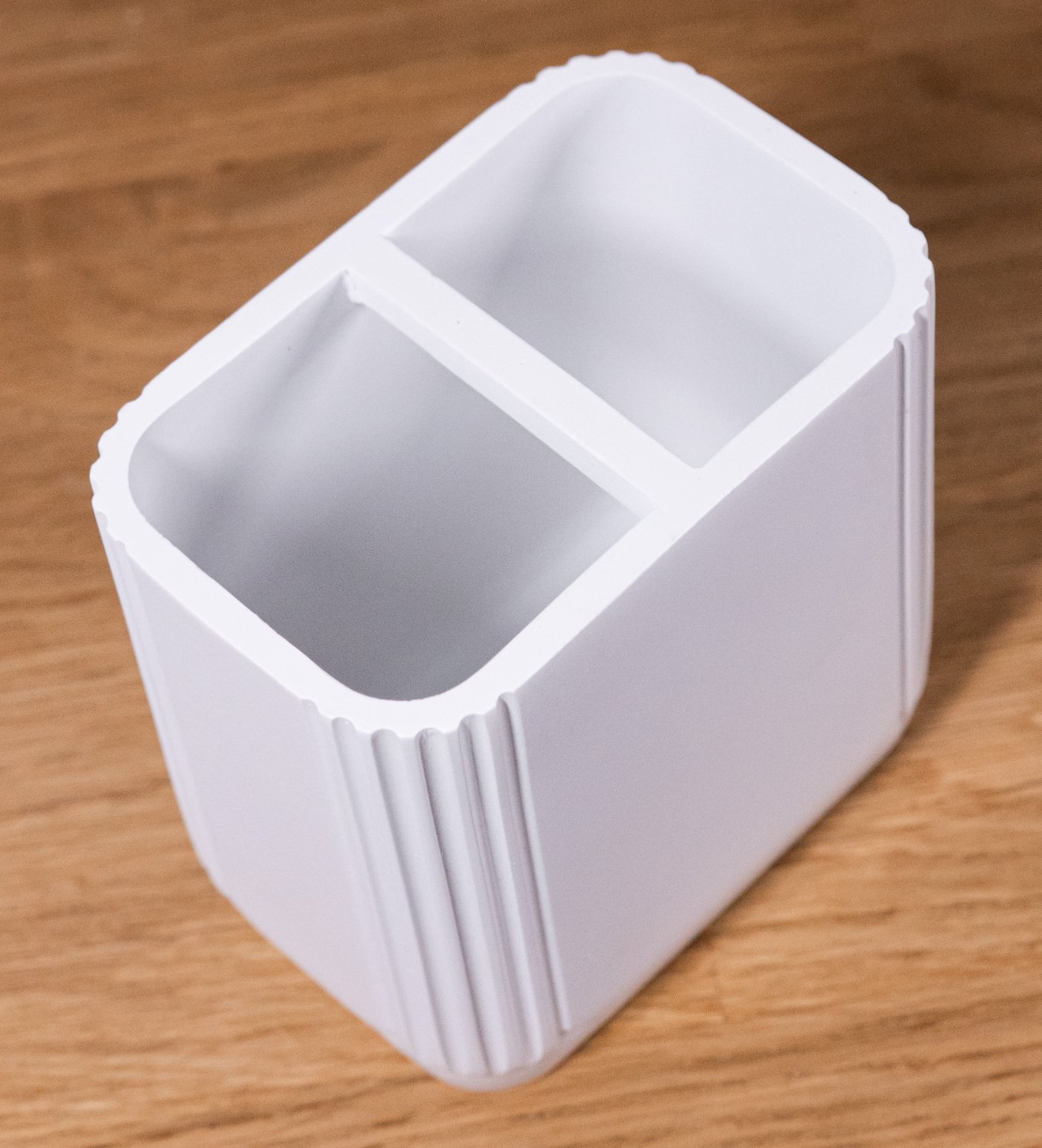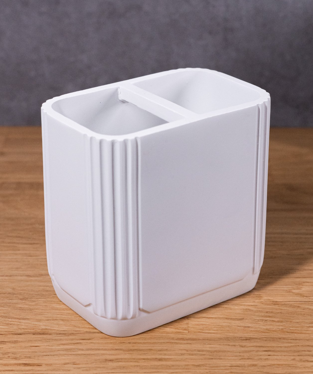 Стакан для зубных щеток и пасты. Разделен на два отсека. Произведено из полирезина. Цвет белый с рельефным рисунком.