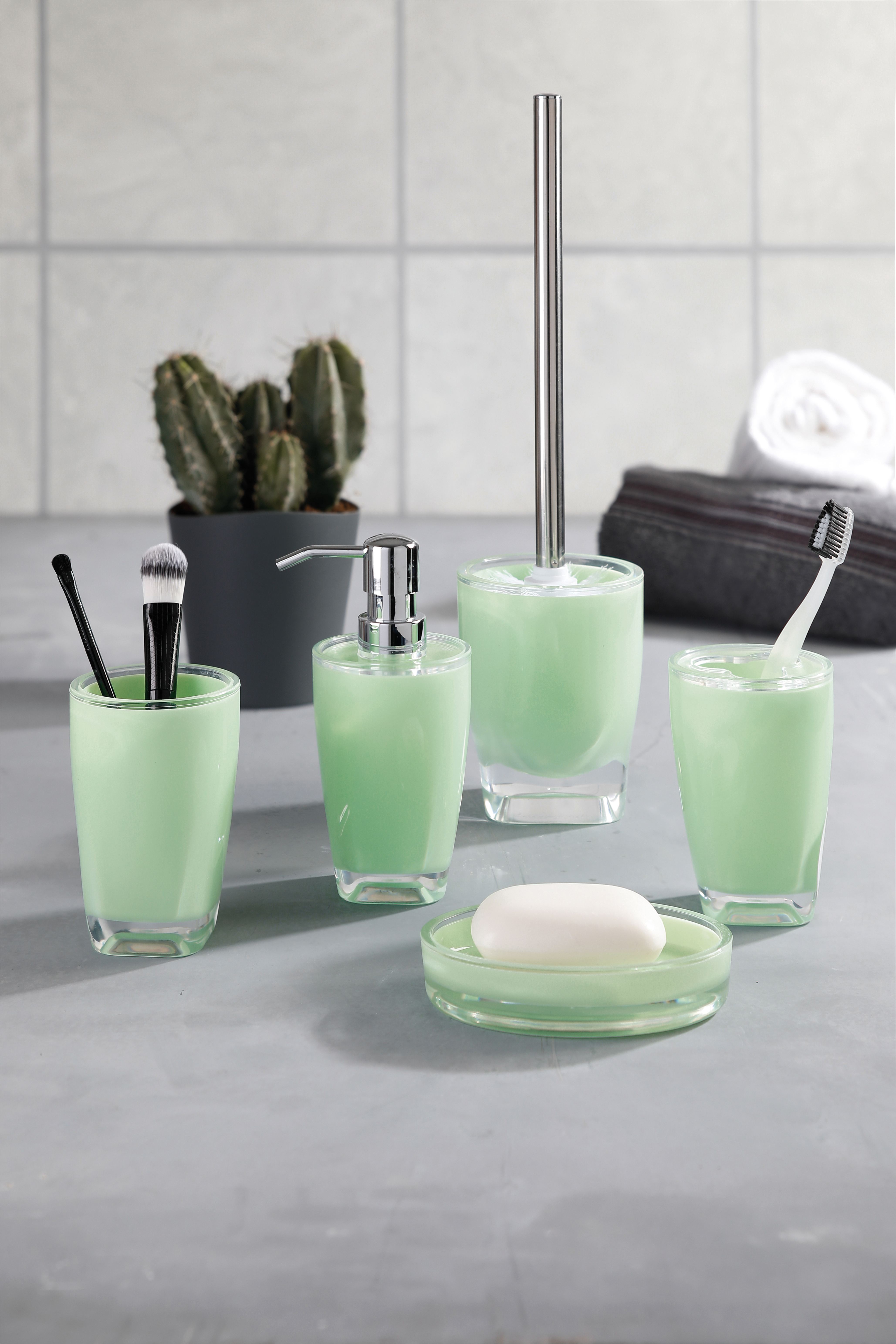 Стакан косметический настольный. Произведено из пластика. Цвет светло-зелёный. Поверхность глянцевая.