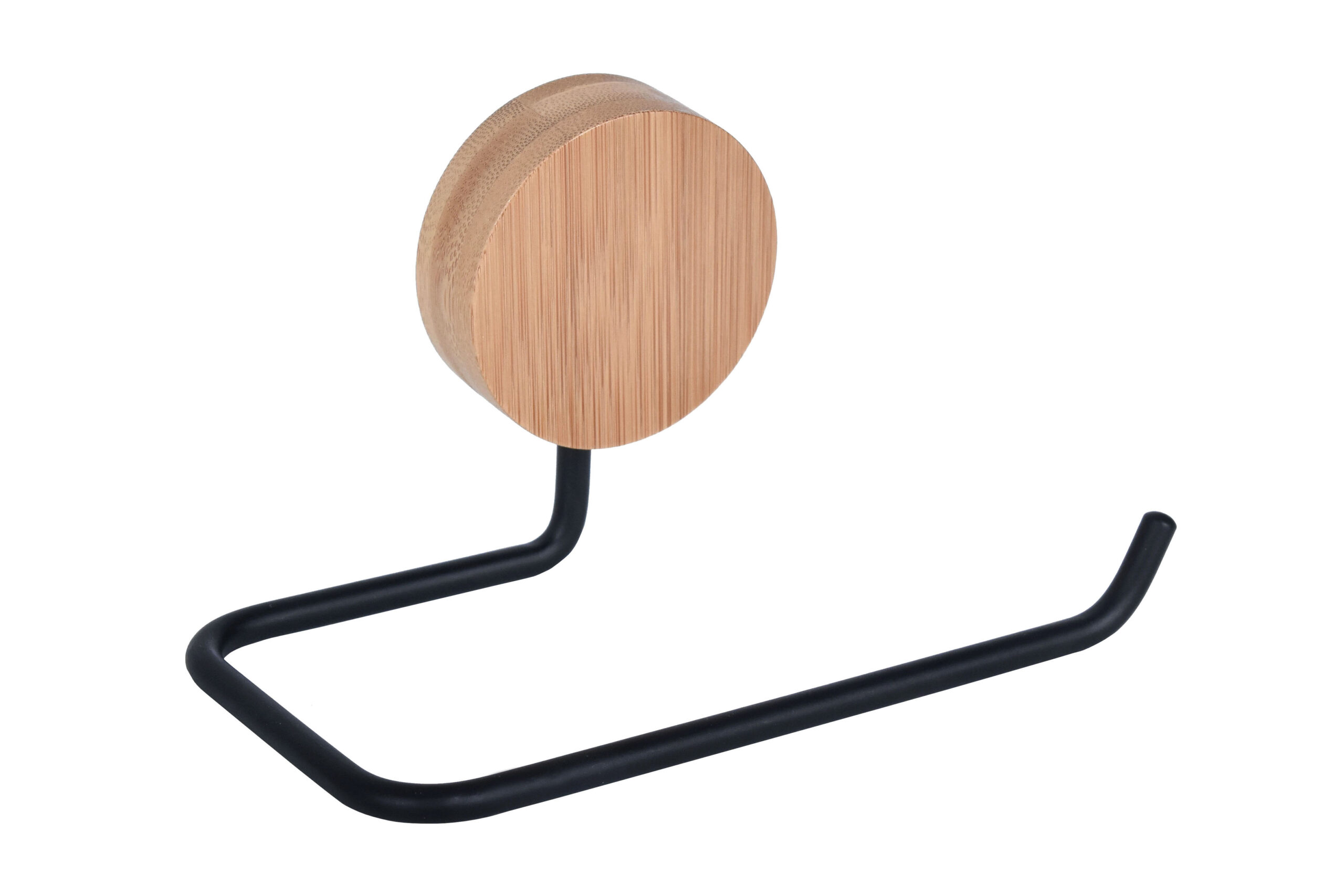 Держатель туалетной бумаги без крышки. Крепится к стене шурупами. Произведено из нержавеющей стали и бамбукового дерева. Крепежные элементы в комплекте.