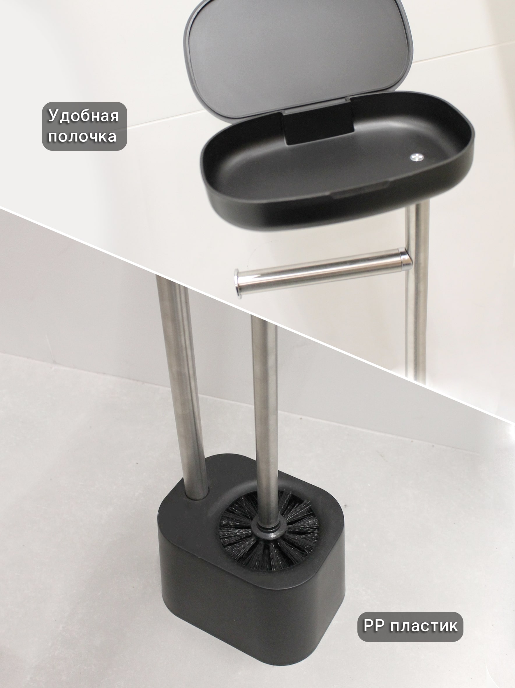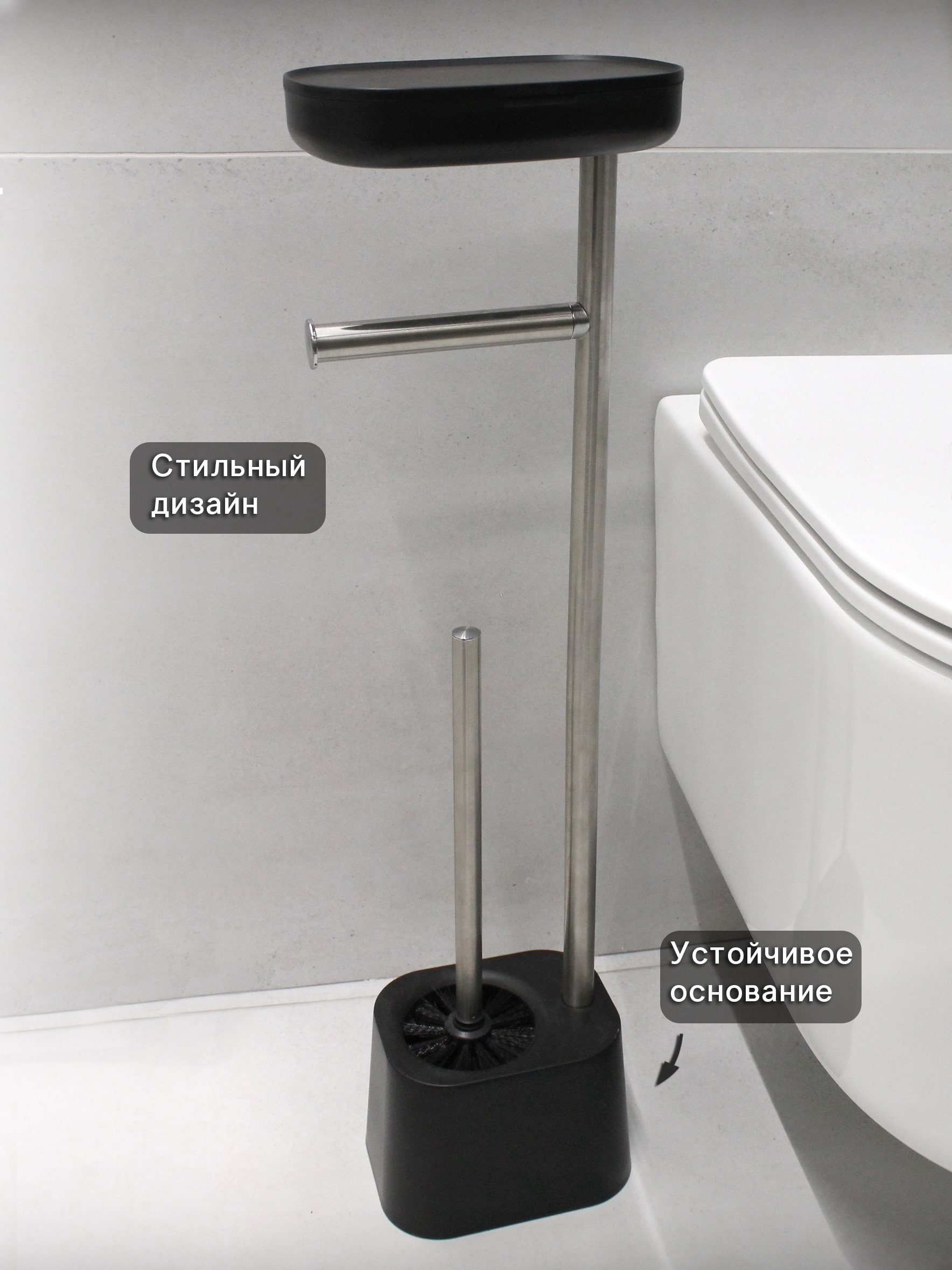 Стойка для туалета напольная. Комплект: держатель для туалетной бумаги, полочка для телефона и щетка для унитаза. Произведено из нержавеющей стали. Поверхность глянцевая. Подставка и полочка черного цвета, изготовлены из пластика. Стойка упакована в картонную коробку.