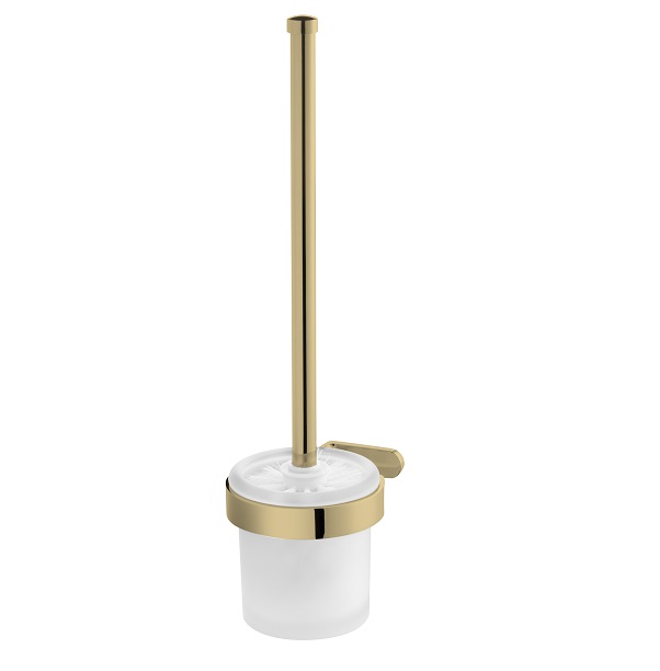 Щетка для унитаза с держателем. Крепится к стене шурупами. Произведено из цинкоалюминиевого сплава с золотистым напылением и матового стекла.
