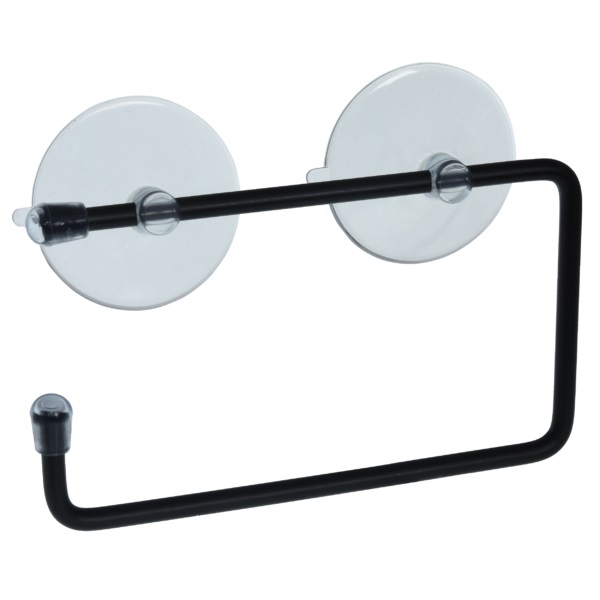 Держатель туалетной бумаги без крышки. Крепится на гладкую поверхность при помощи присосок. Произведено из стального сплава. Цвет черный.
