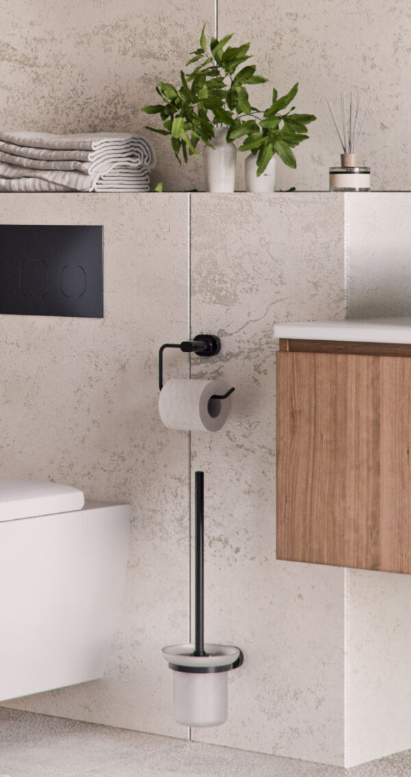 Держатель для туалетной бумаги с крышкой. Крепится к стене шурупами или специальным двухкомпонентным клеем для металла и керамики. Произведено из цинкоалюминиевого сплава с матовым покрытием черного цвета.