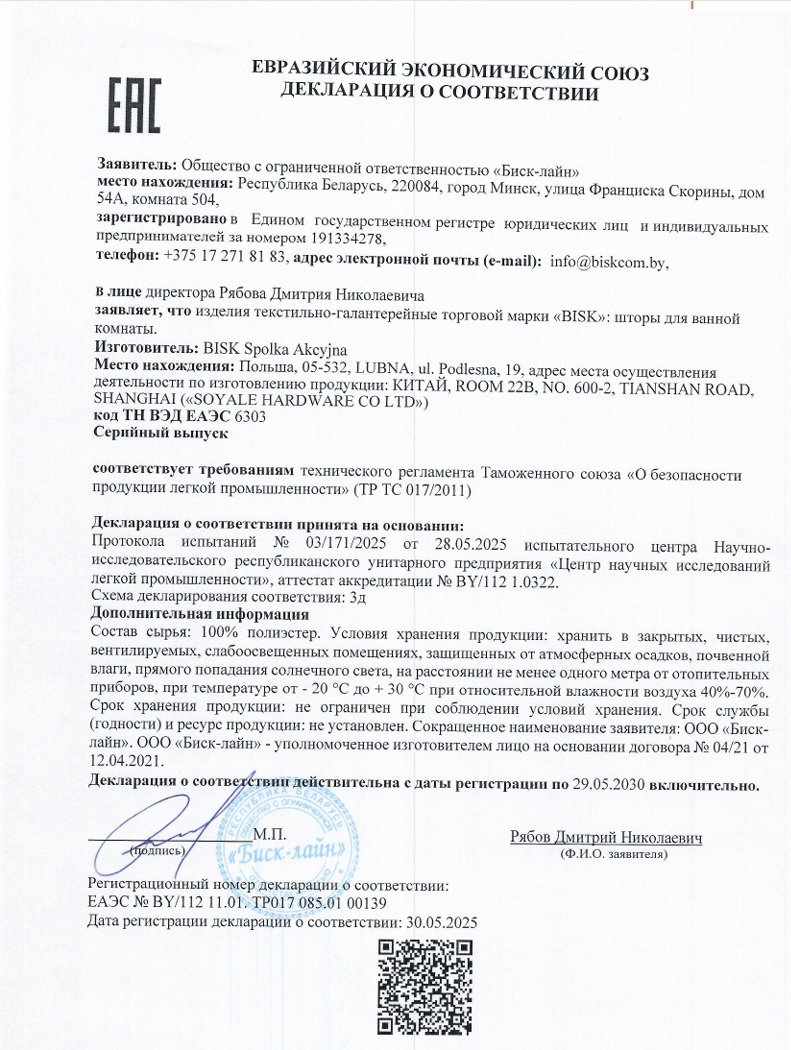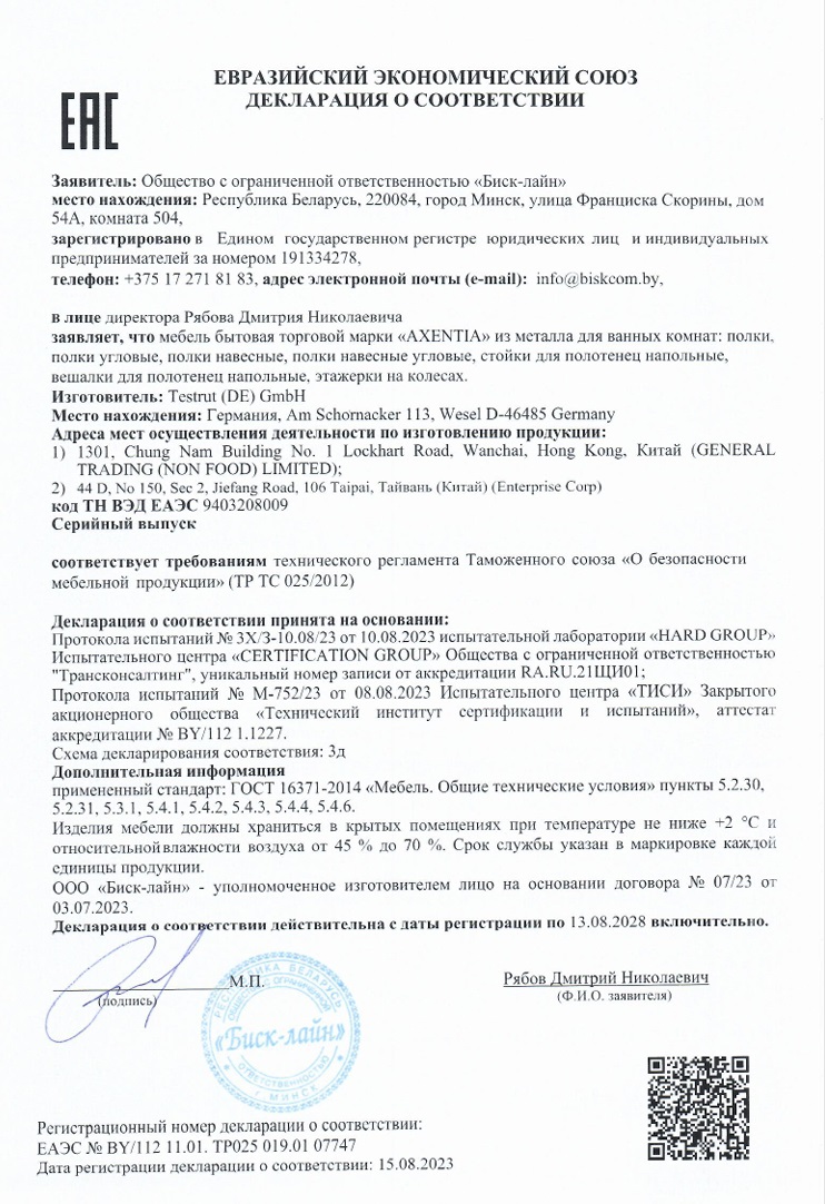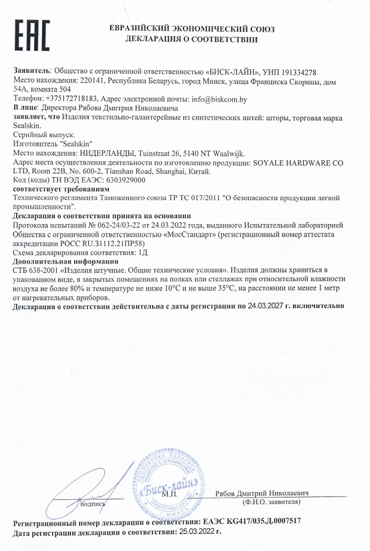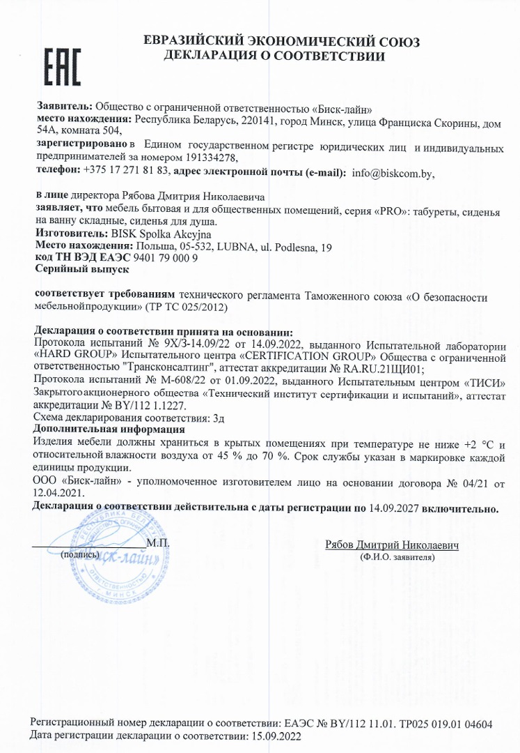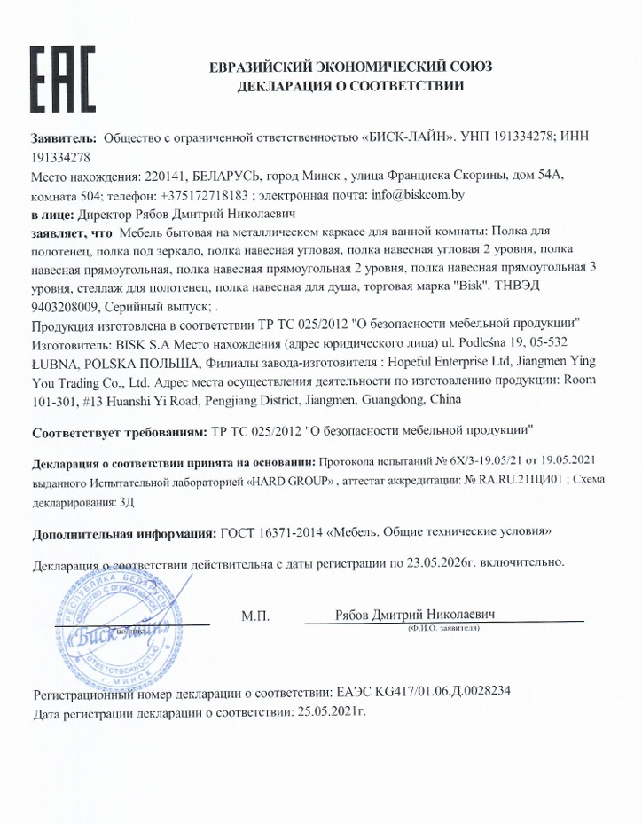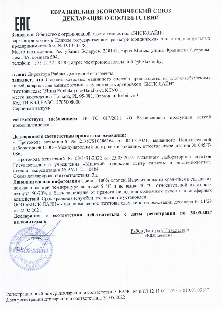 Наша продукция соответствует требованиям Технического Регламента Таможенного Союза «О безопасности мебельной продукции (ТР ТС 025/2012)», ковры - требованиям Технического Регламента Таможенного Союза «О безопасности продукции легкой промышленности (ТР ТС 017/2011)
